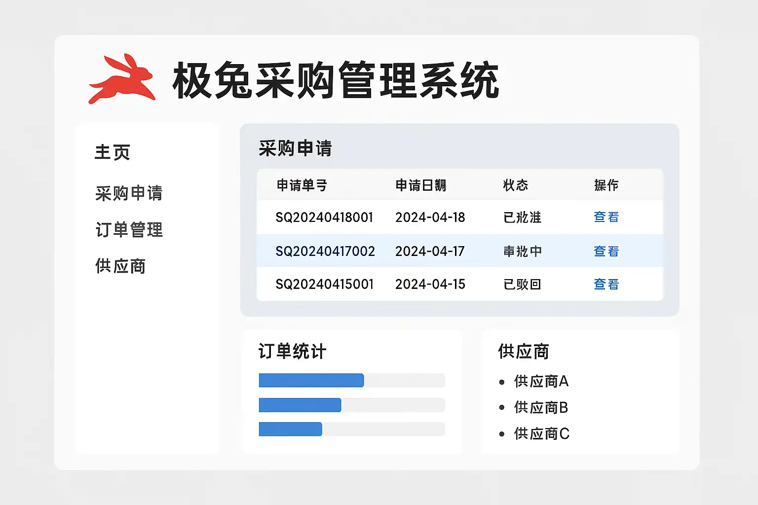 极兔采购管理系统通过采购需求申请、审批、比价、下单、收货、对账等全流程的数字化,实现了端到端的自动化管理。系统不仅支持自定义采购流程、灵活设置审批节点,还集成了即时提醒和流程追溯功能,使采购环节一目了然。所有操作都被自动记录,便于后期跟踪和审计,极大减少了“暗箱操作”与人为干预。采购审批从原来的几天缩短到几小时,常规订单处理效率提升30%以上,为企业带来实实在在的价值。