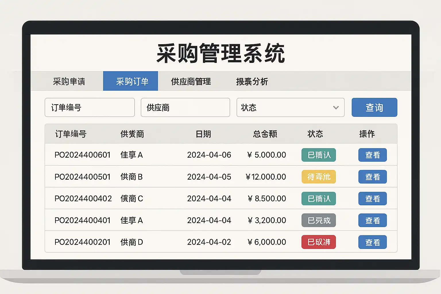 - 供应商门户:供应商可在线提交资质材料、报价、发票等,实现信息透明共享。