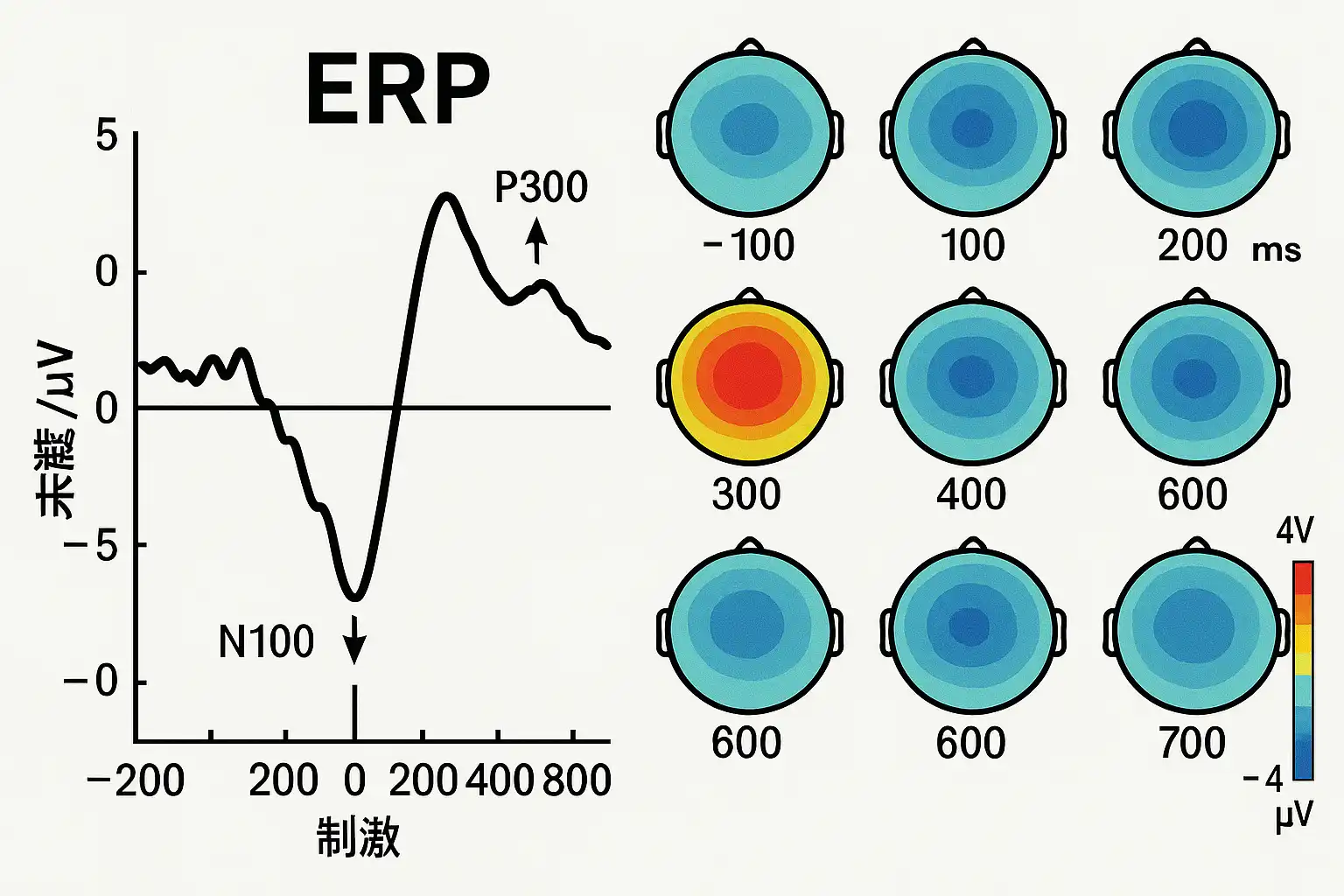 - 原理:当大脑受到特定刺激时,神经元群体会同步产生微弱电信号,通过头皮电极进行采集。这些信号经过多次叠加、平均,消除杂波后得到ERP波形。