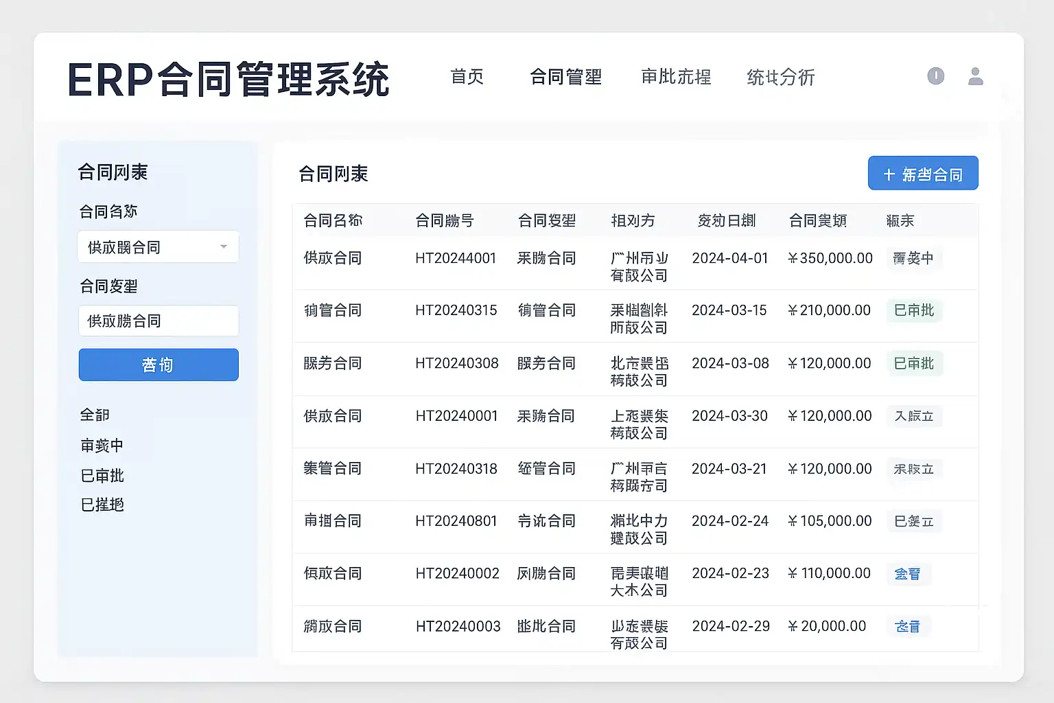 数据分析与风险预警 系统内置合同台账、履约分析、风险预警报表。管理者可实时掌握合同执行进展、风险节点,辅助决策。