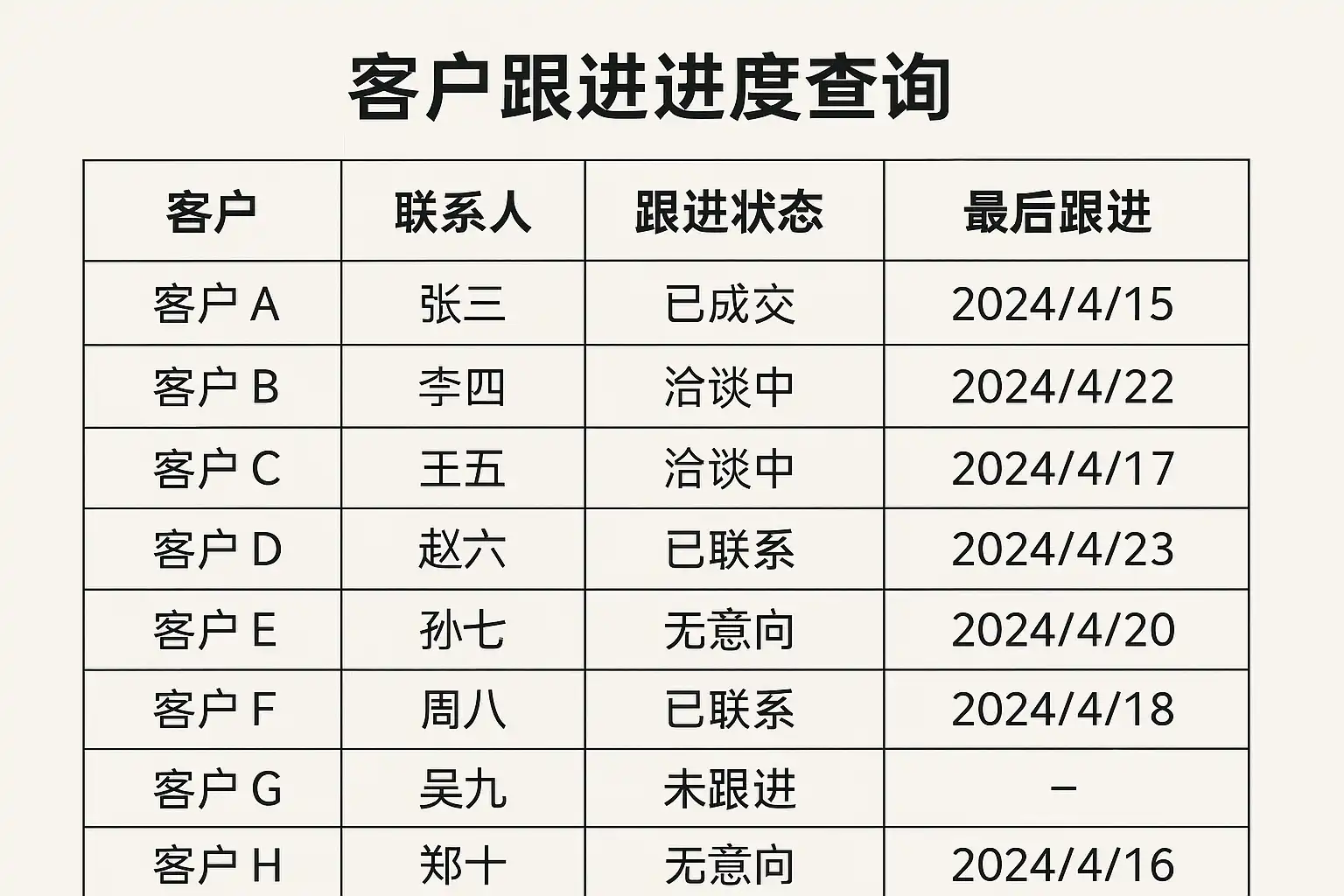 - 表格结构化展示客户信息、跟进时间和进度状态,方便比较和筛选。