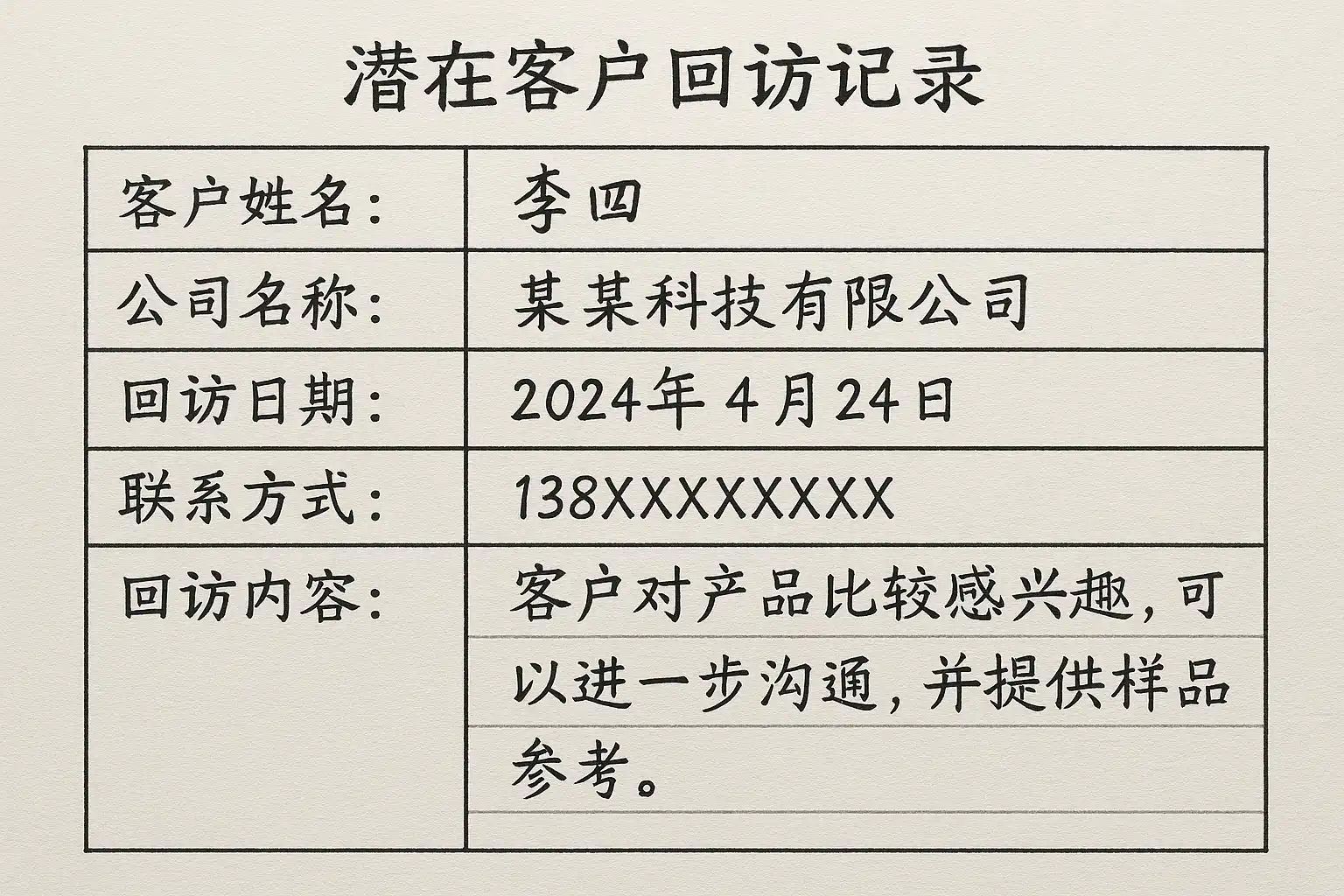 | 回访内容记录 | 详细记录谈话内容、客户反馈、下一步行动 | CRM沟通日志 |