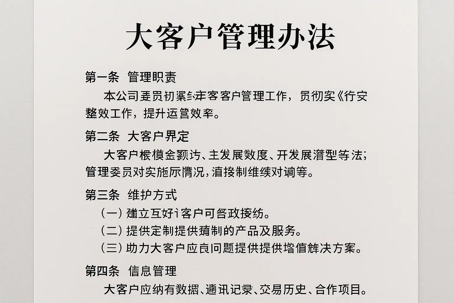 大客户管理是企业价值创造链中的关键环节。其核心目标在于通过科学方法,提升客户满意度、忠诚度及合作深度,实现双方的长期共赢。具体办法需遵循以下原则: