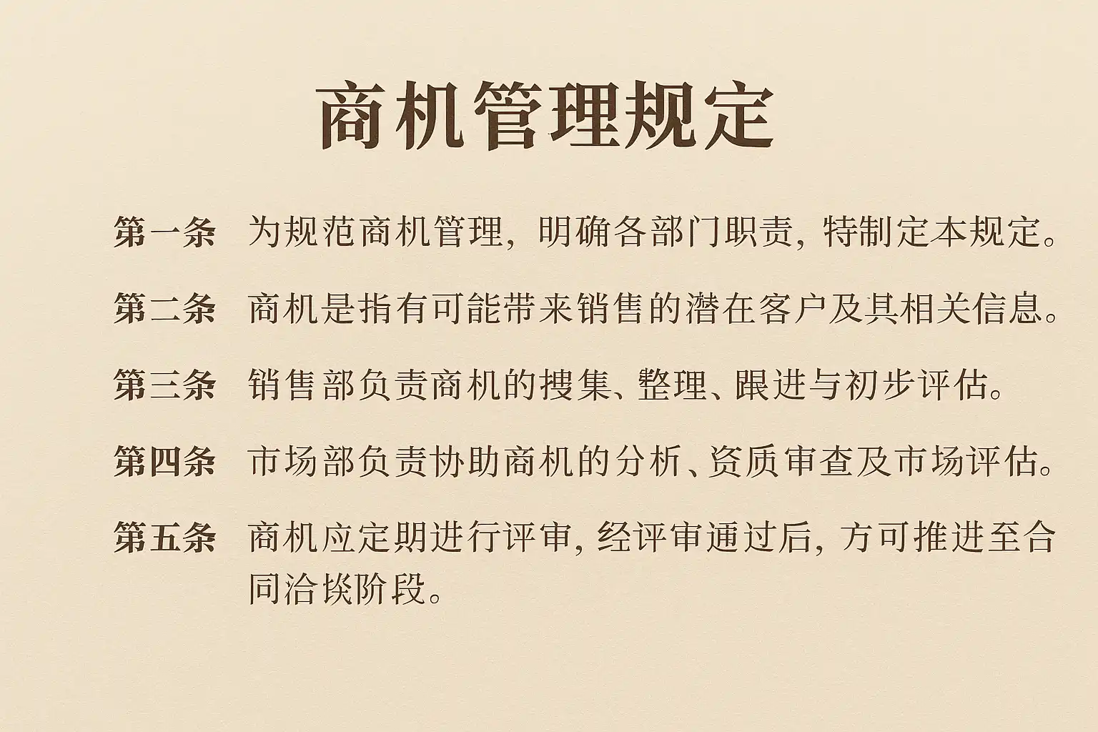 商机管理规定是企业针对销售流程、商机跟进、客户维护等环节设立的制度与标准,是提升销售业绩的基础。合理的商机管理规定不仅规范了销售行为,还能够提升团队执行力和数据透明度。