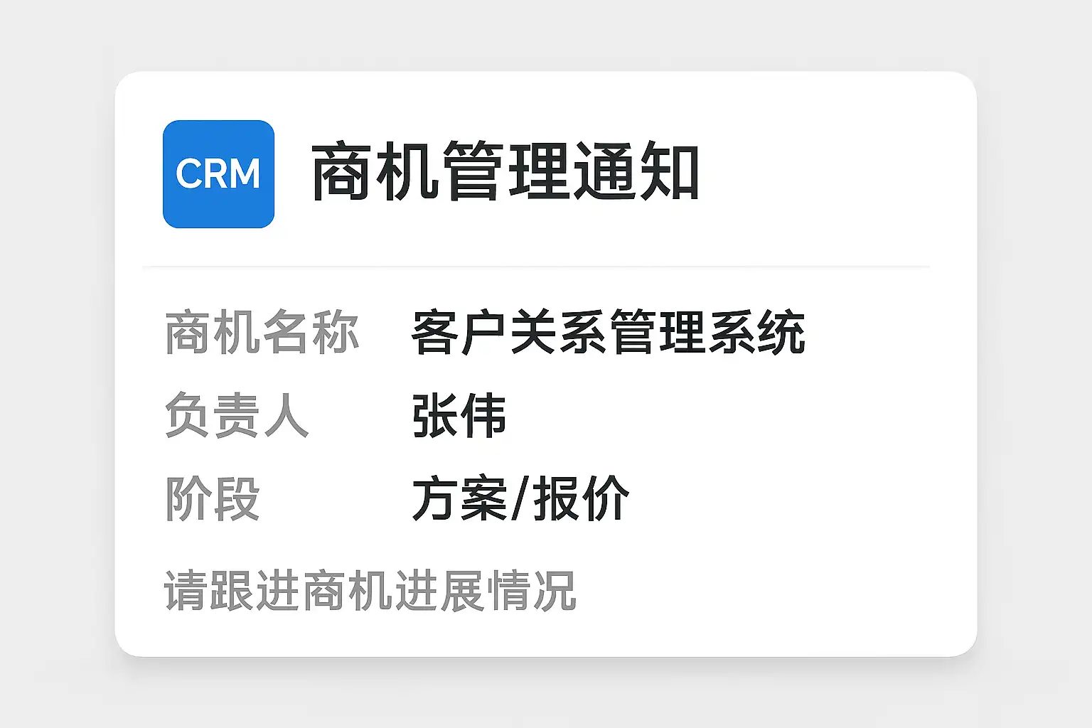 - 优化管理与协作:管理层可通过通知了解商机进度,优化资源分配和团队协作。