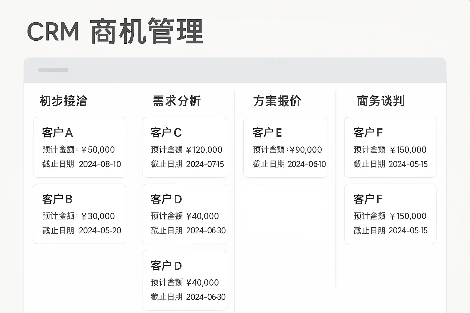 CRM商机管理通过系统化跟踪和管理潜在客户,提升销售转化率。具体包括: