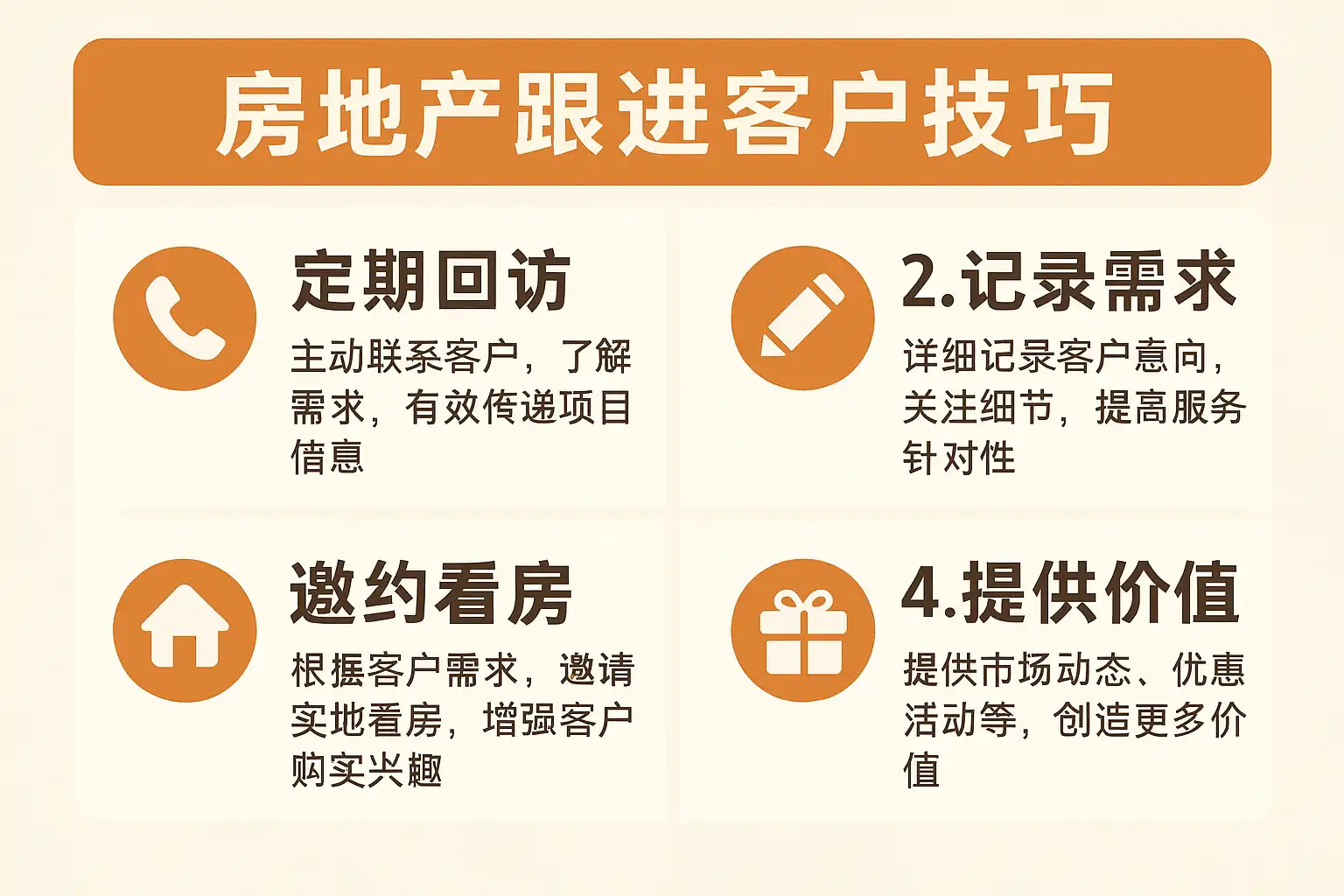 - 定期回访,主动关心客户购房进展,及时推送新政策或优惠信息。