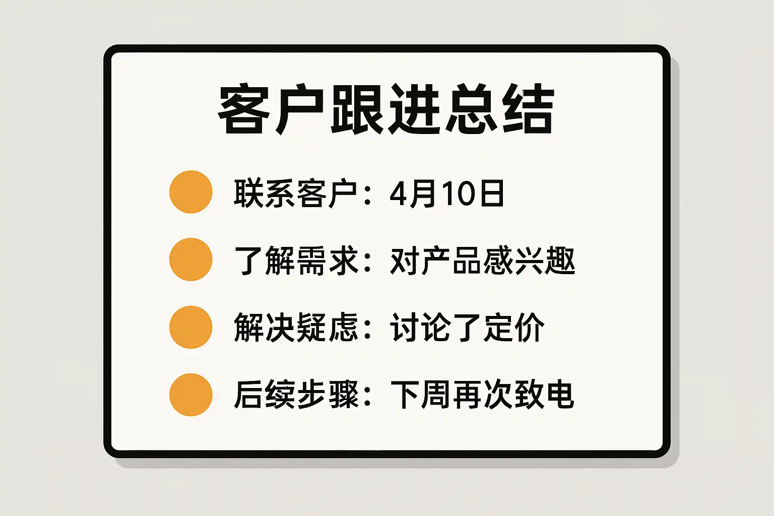 - 跟进总结要及时、真实、完整,避免“只报喜不报忧”或信息遗漏。