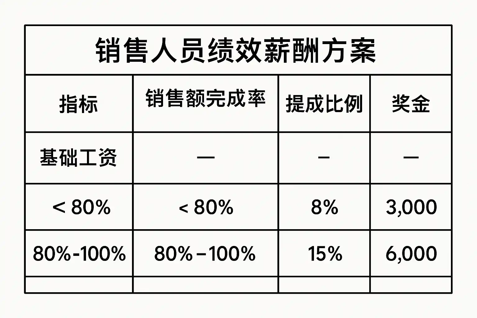 | 阶梯式提成 | 达到不同业绩档次对应不同提成比例,激励冲刺高目标 |
