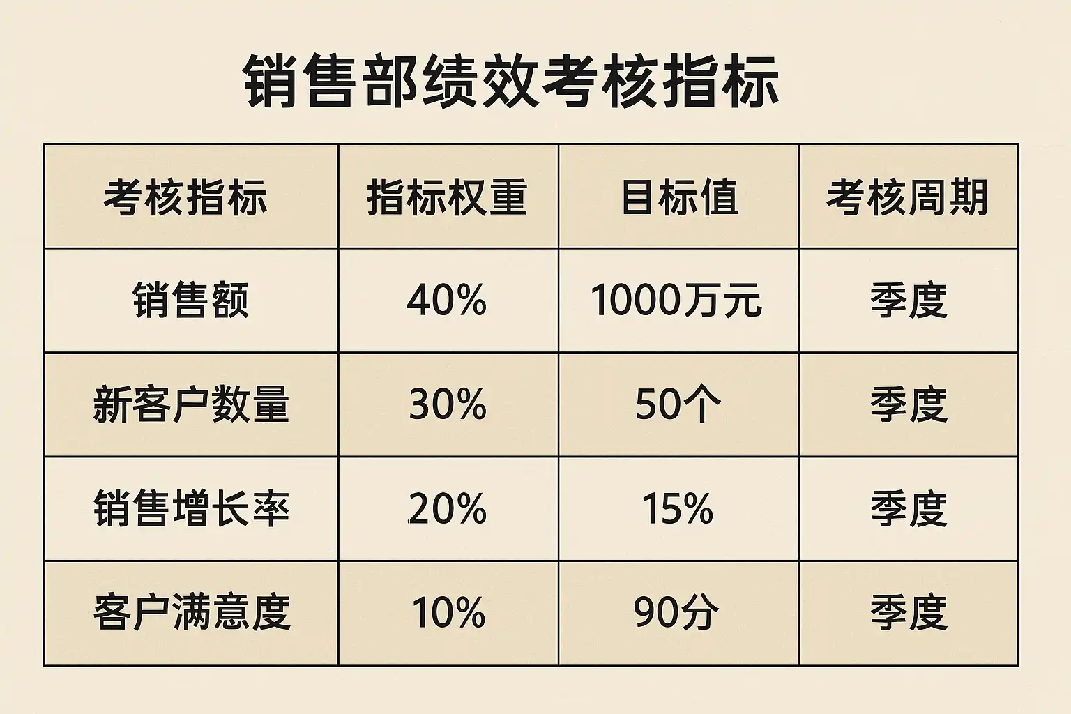 | 目标梳理 | 对齐公司战略,量化销售目标 | 确保考核目标服务于企业整体发展 |