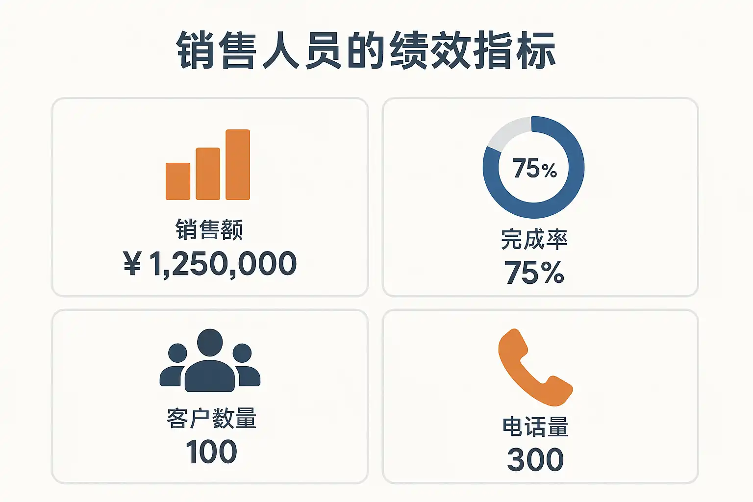 销售人员的绩效指标是衡量其销售工作效果和贡献度的重要标准。常见的绩效指标主要包括以下几个方面: