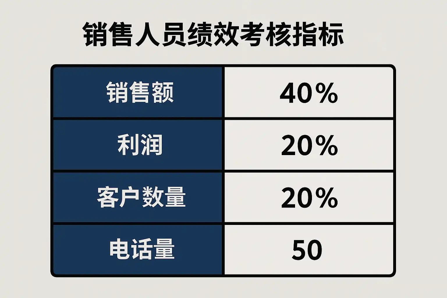 | 定量指标 | 销售额、回款额、客户新增数量、订单数、完成率 | 以数据为基础,衡量结果,易于统计与对比,最常用。 |