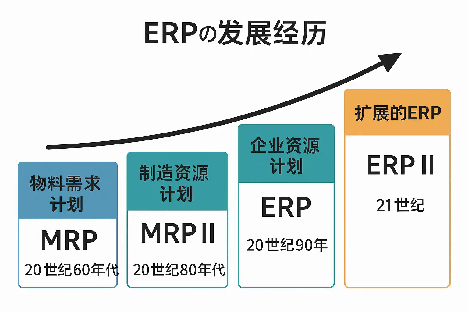 | MRP II阶段 | 1980s | 制造资源计划,拓展到财务、人力等模块 | MRP II |
