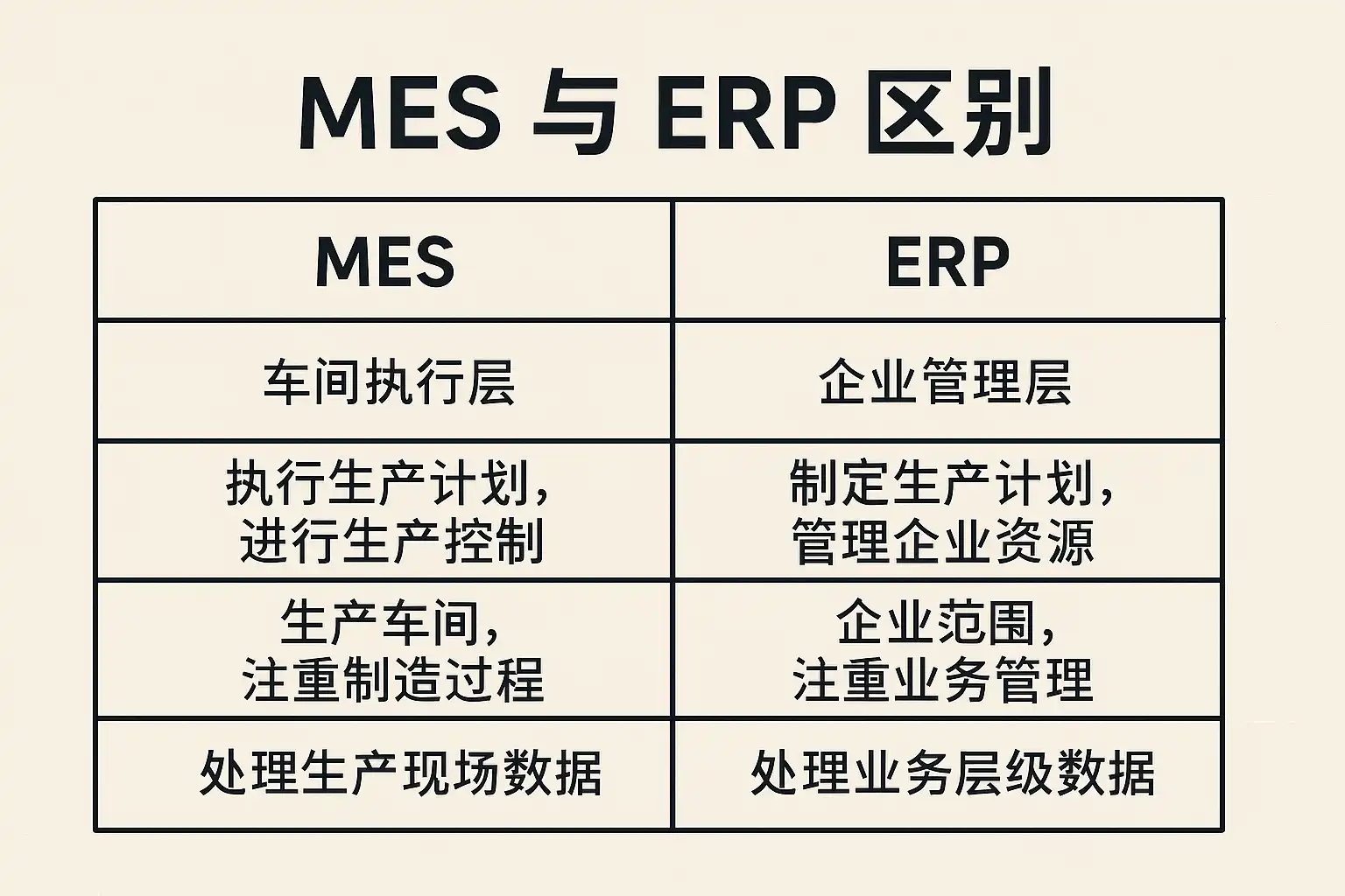 | 关注点 | 生产过程实时执行 | 企业整体资源计划与管理 |