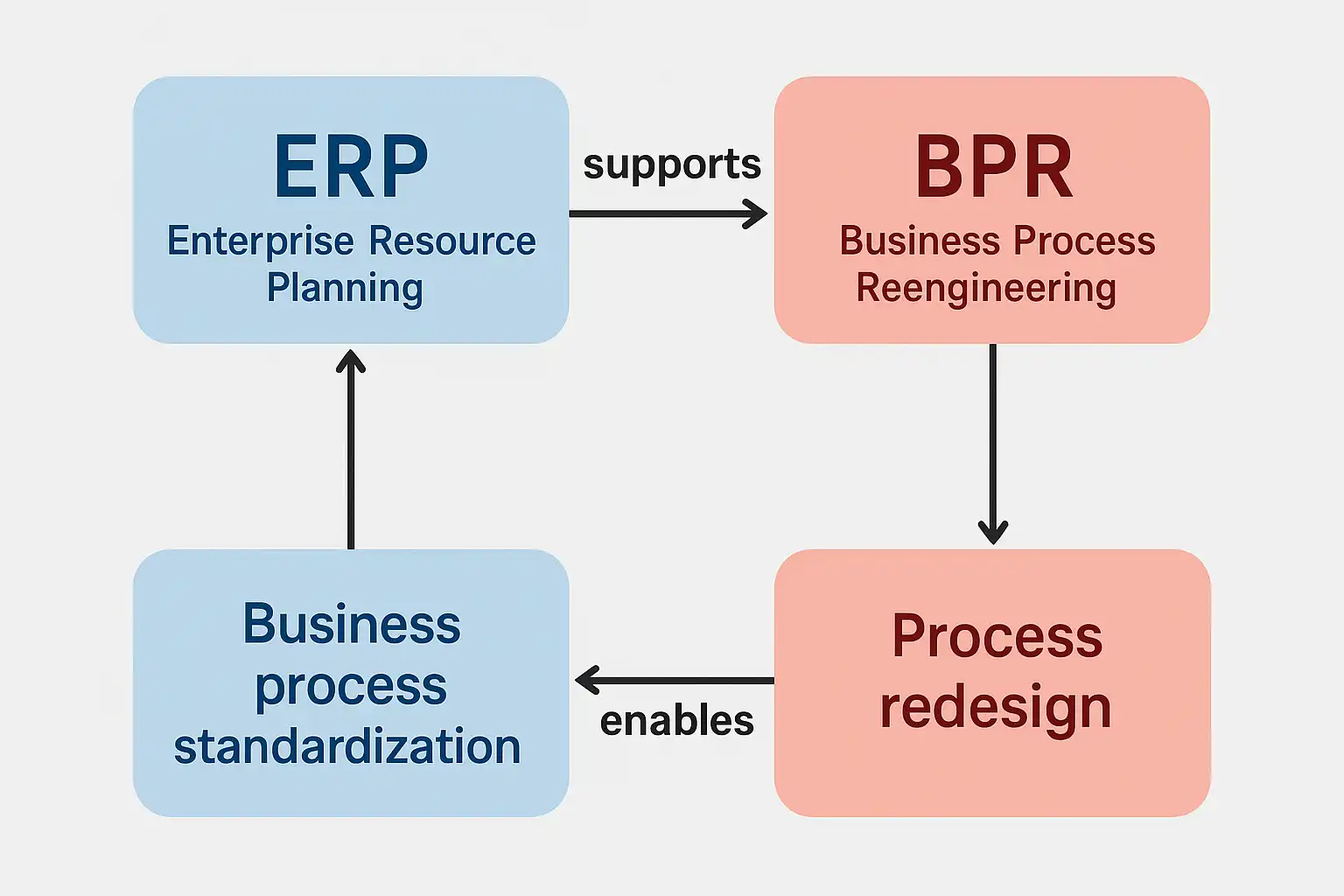 ERP与BPR关系密切,ERP是实现BPR目标的技术手段,而BPR则为ERP系统提供流程优化的业务基础。企业在推进BPR时,往往需要ERP系统来支撑流程变革后的信息化需求,确保新流程能够高效、标准化地运行。