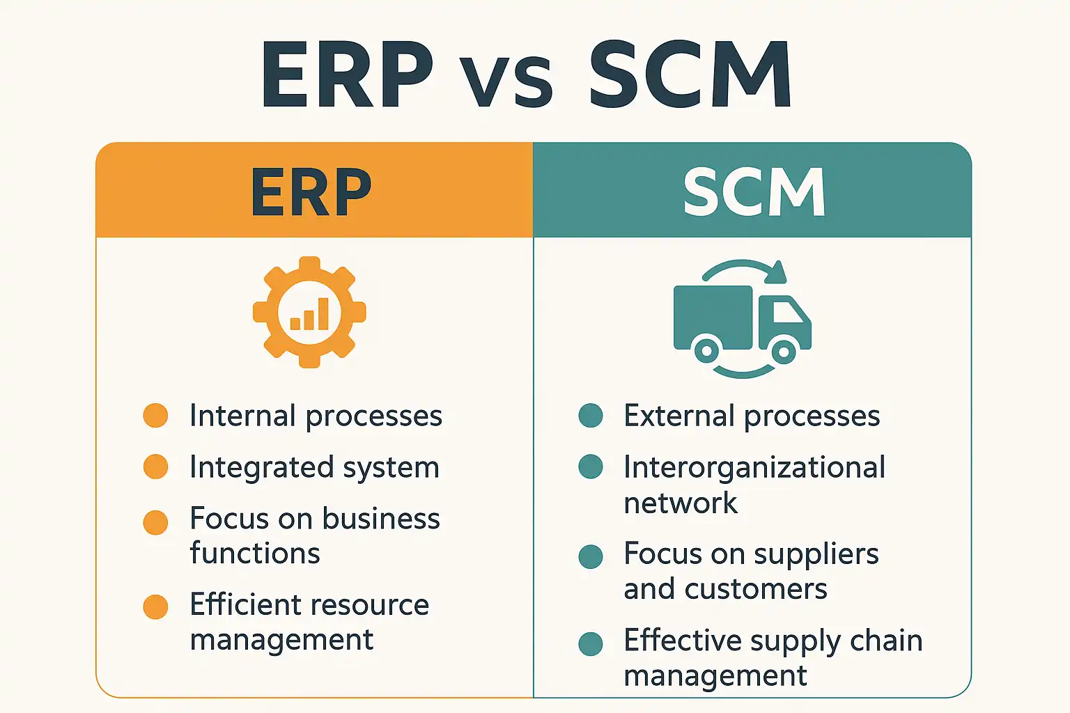 ERP(企业资源计划)主要聚焦企业内部资源的整合管理,包括财务、生产、人力资源及库存管理;而SCM(供应链管理)则专注于整个供应链的协调与优化,如采购、物流和供应商管理。简言之,ERP是内部运营的中枢,SCM是跨企业协同的桥梁。