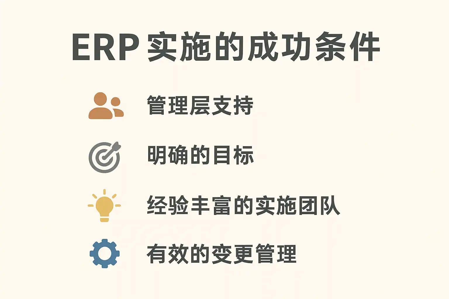ERP实施是一项复杂的系统工程,影响其成败的因素众多。以下为公认的关键成功条件: