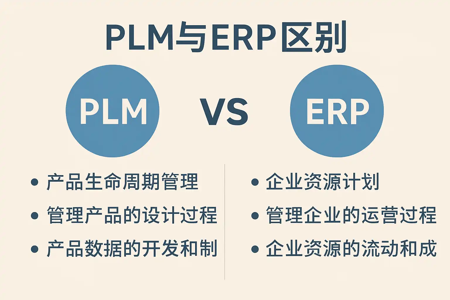| 适用阶段 | 新产品开发、设计变更、技术文档管理 | 运营、生产、供应链、销售、财务、人力资源管理 |
