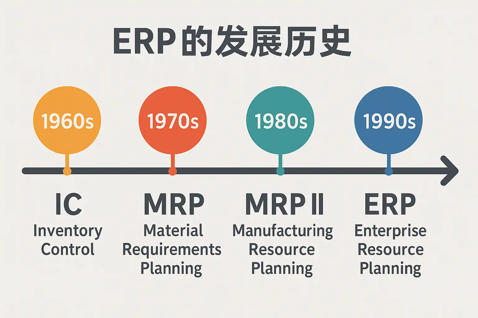 - 1960-1970年代:物料需求计划(MRP)阶段,主要解决库存管理问题。