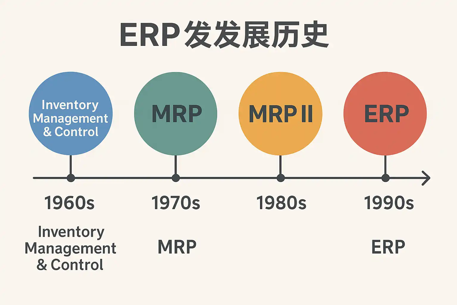 | MRP | 物料需求计划,关注库存、采购 | IBM MRP、SAP R/1 | 1960s-1970s |