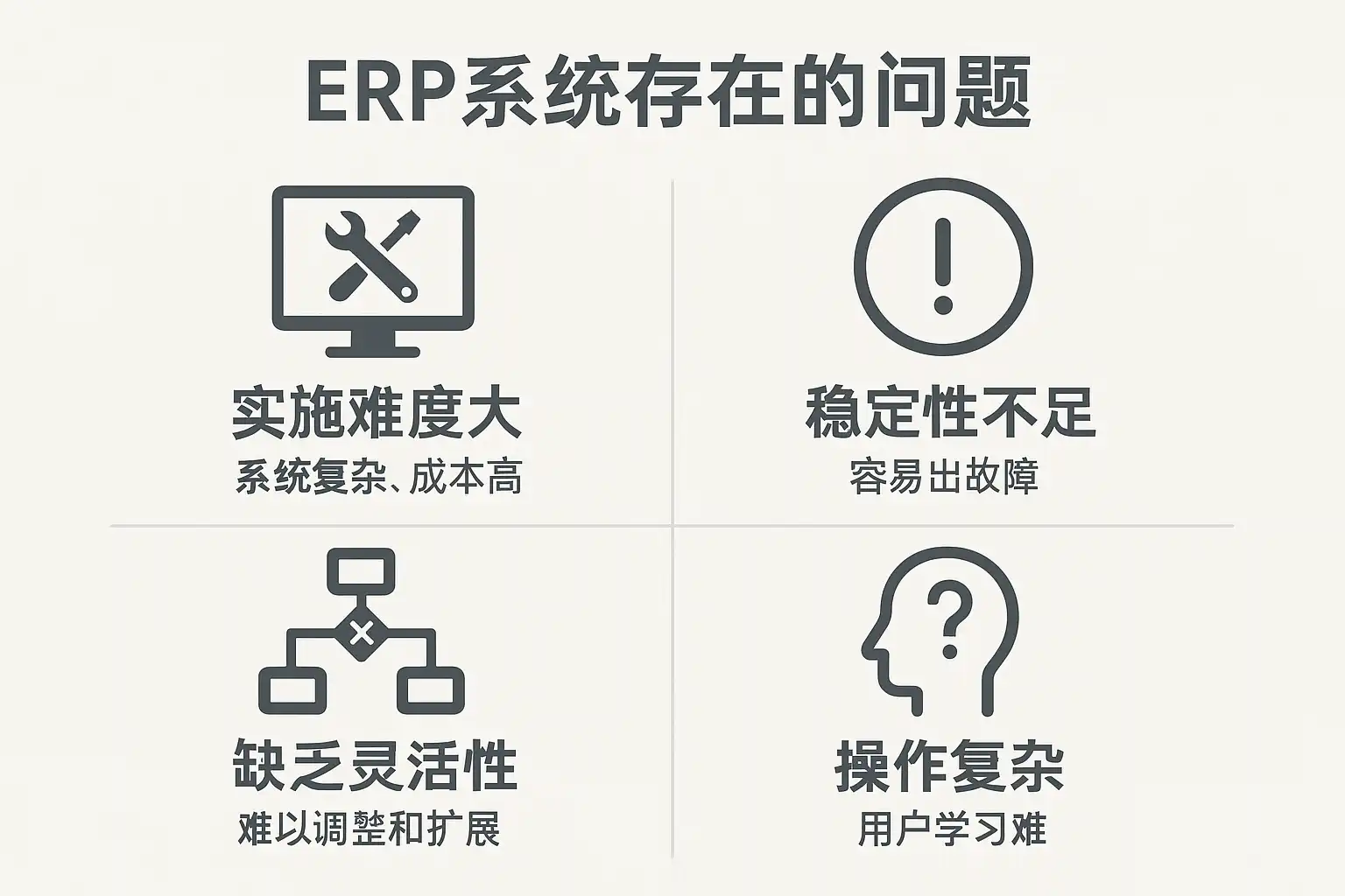 - 用户操作复杂 传统ERP界面繁琐、功能分散,普通员工上手难度大,需反复培训,影响推广和应用。