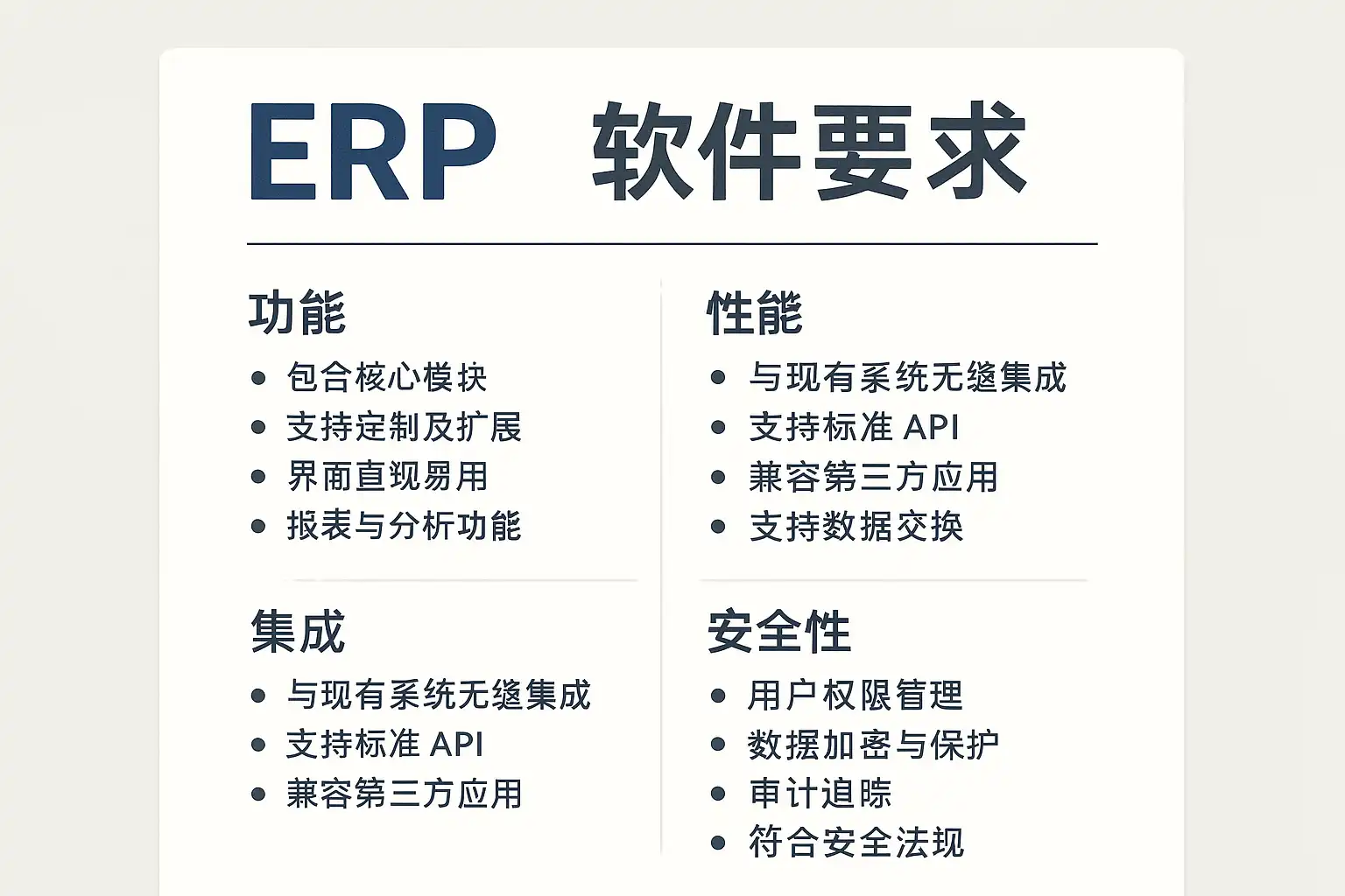 - 功能完整性:系统需覆盖财务管理、供应链、生产计划等核心模块。