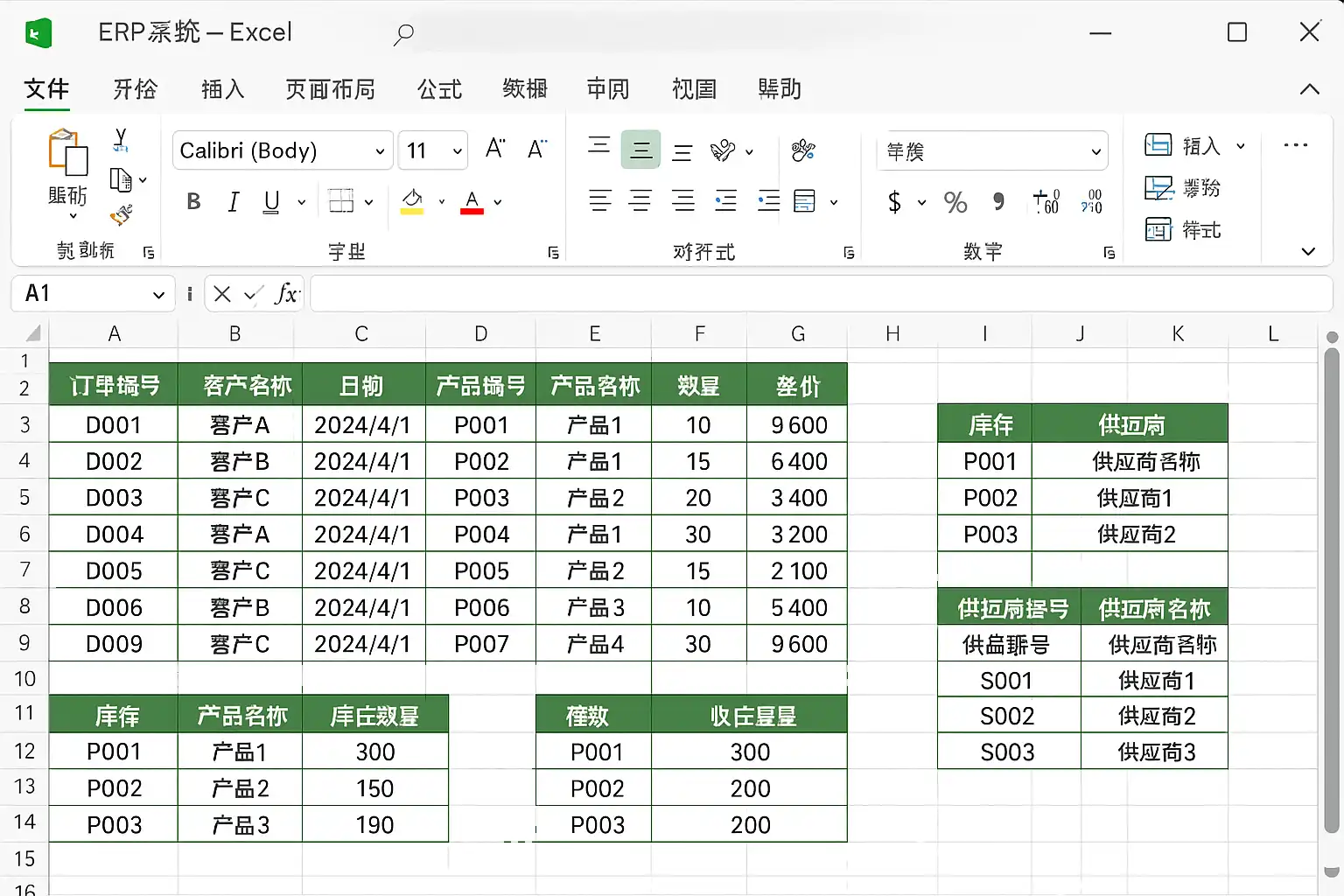 | 采购 | 采购单、入库单、供应商表 | VLOOKUP查找,SUM自动汇总 |