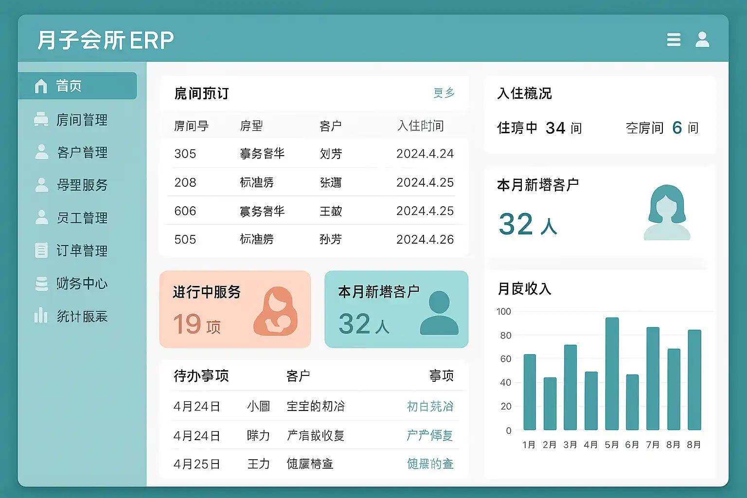 背景说明: 这些功能模块的集成,实现了月子会所从前端客户服务到后端资源管理的全流程数字化。以数据为驱动,各部门信息实时共享,管理层可随时掌握经营动态,及时优化决策。例如遇到客户高峰期,系统能自动调配护理人员与房间资源,避免服务瓶颈。