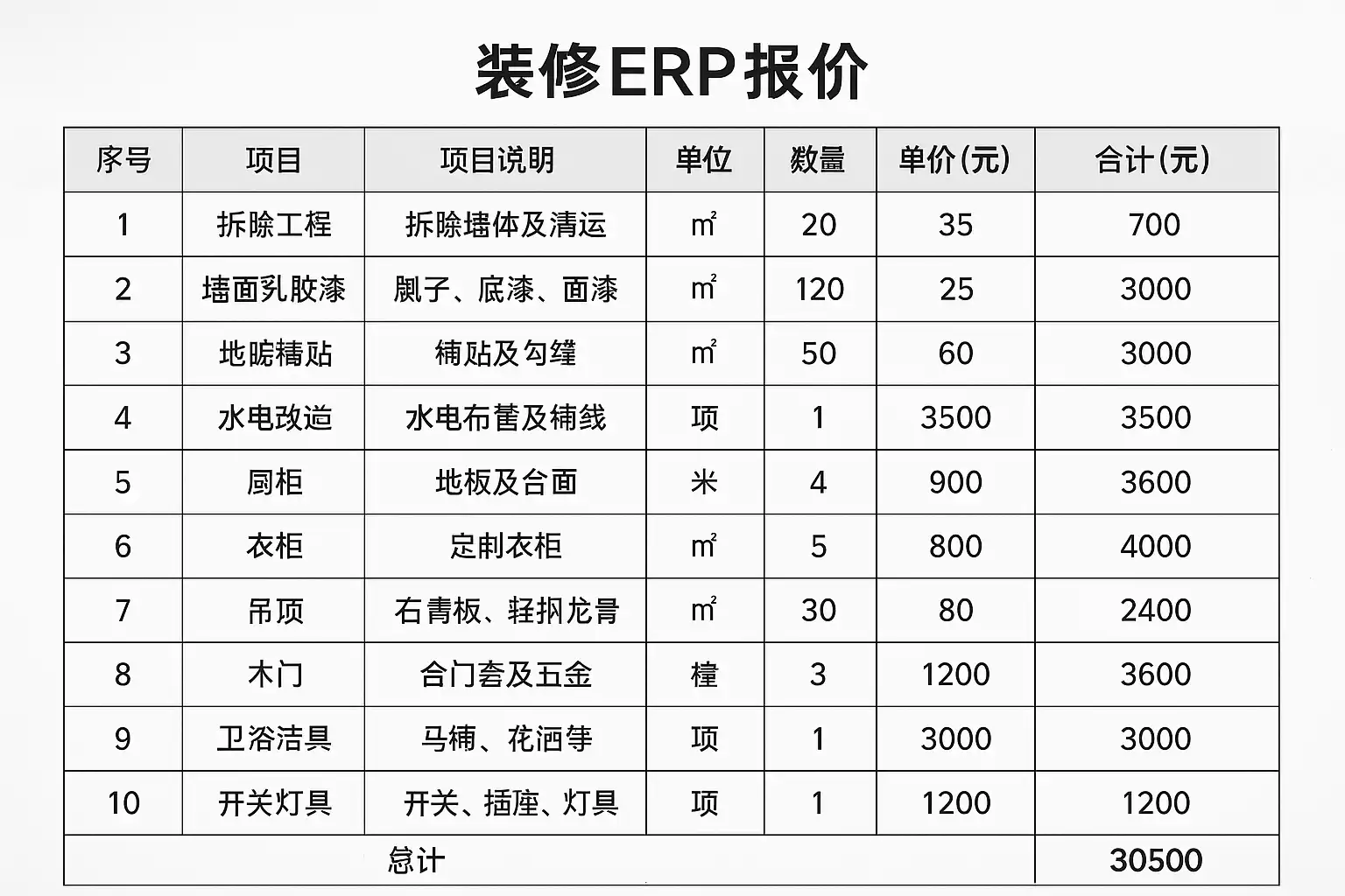 装修ERP报价主要包含以下费用: