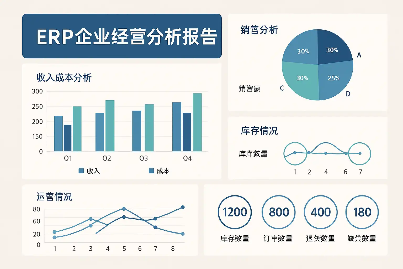 ERP企业经营分析报告通过整合财务、库存、销售等多维度数据,提供实时、精准的经营状况洞察。利用报表中的关键绩效指标(KPI)和趋势分析,管理层可以快速发现运营瓶颈,从而优化资源配置。比如,通过销售数据分析发现某产品销量下滑,及时调整市场策略,提升整体管理效率。根据2023年数据显示,使用ERP分析报告的企业管理效率平均提升了18%。