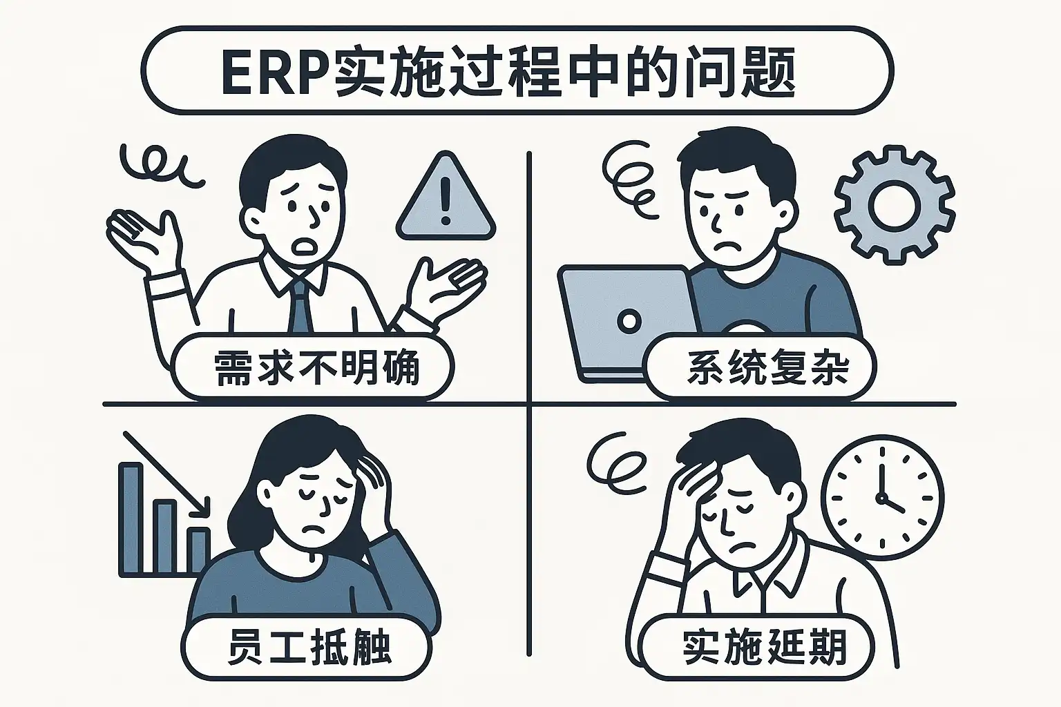 我在了解ERP系统实施时,发现大家都提到各种难题,但具体都有哪些是最常见的?能否帮我梳理一下ERP实施过程中经常遇到的问题,方便我提前做好准备?