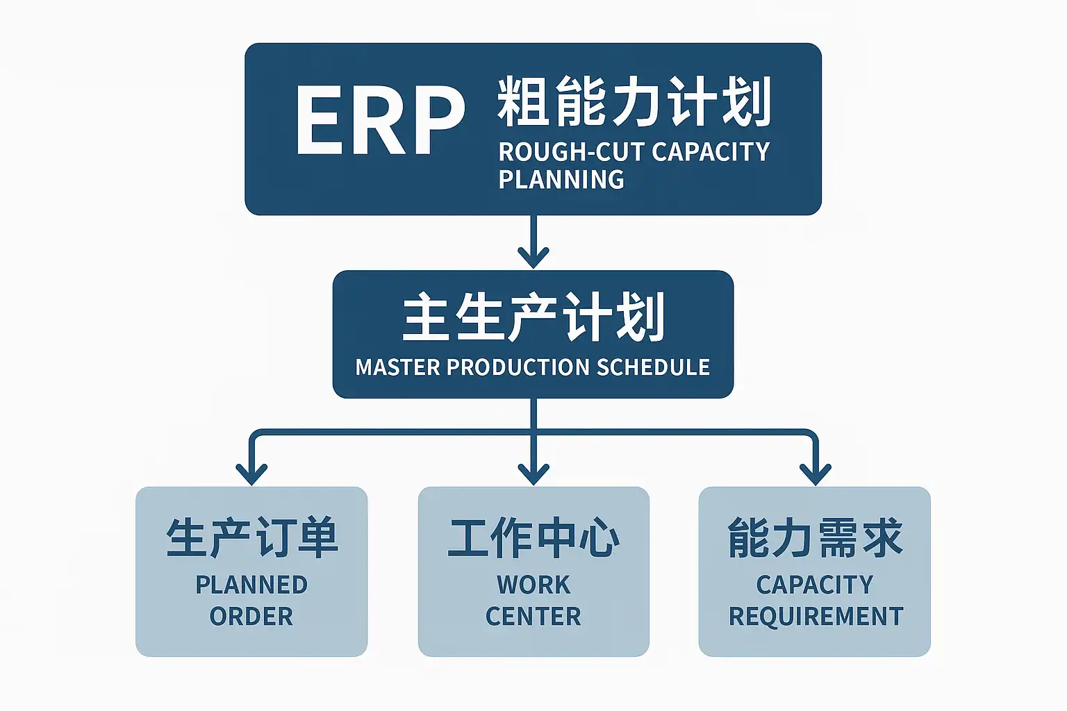 ERP系统中的粗能力计划(RCCP)是将主生产计划(MPS)与企业的关键资源能力进行初步匹配与校验的管理工具,属于生产计划的中层环节。其目标在于以较低的细节和较快的速度,初步判断企业的主要资源(产线、关键工序、瓶颈设备等)能否支撑MPS的各项需求。