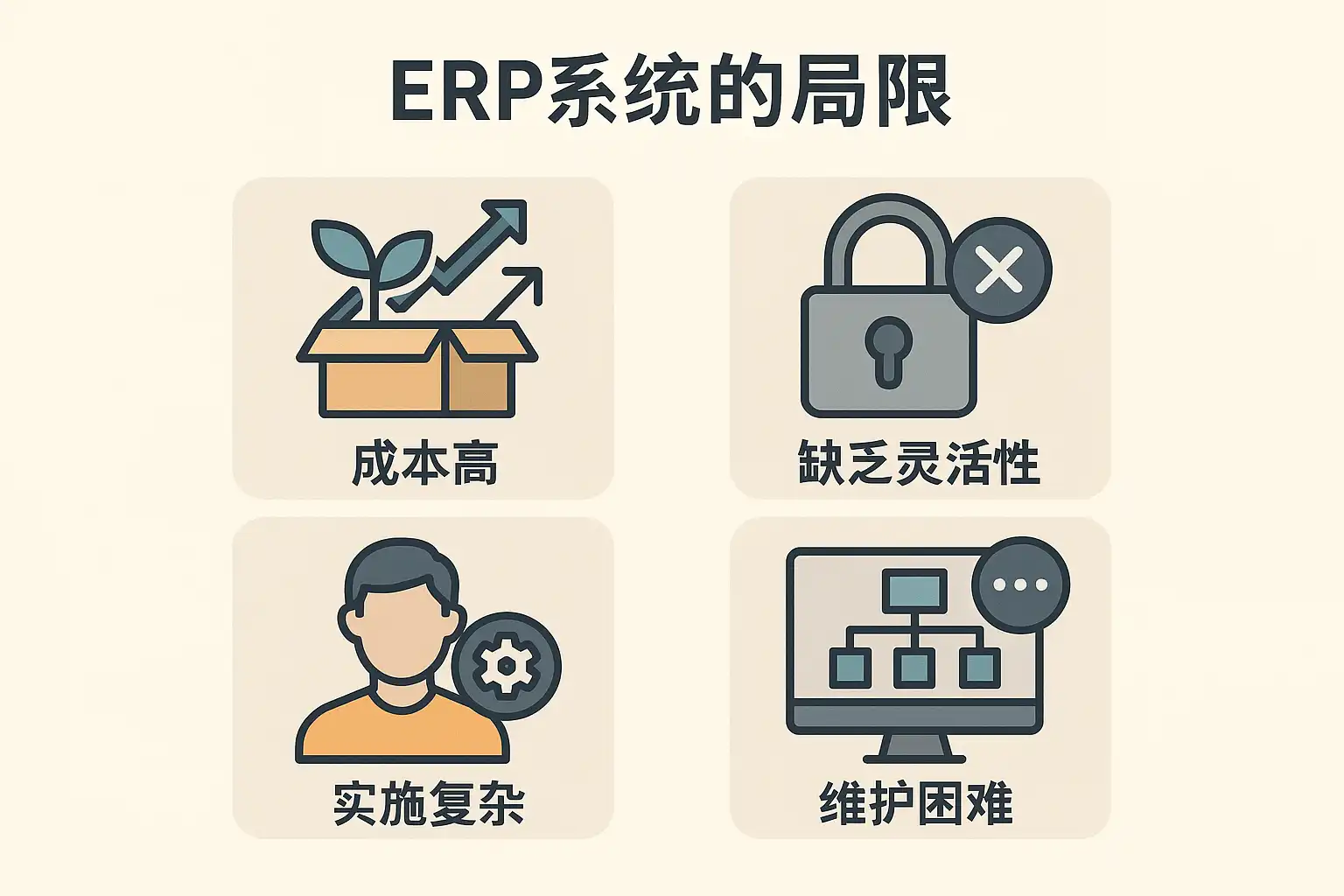 ERP(企业资源计划)系统历经数十年发展,已成为企业数字化转型的基础设施之一。然而,实际应用中仍面临多方面的限制。以下梳理ERP系统常见的局限,并结合原因分析。