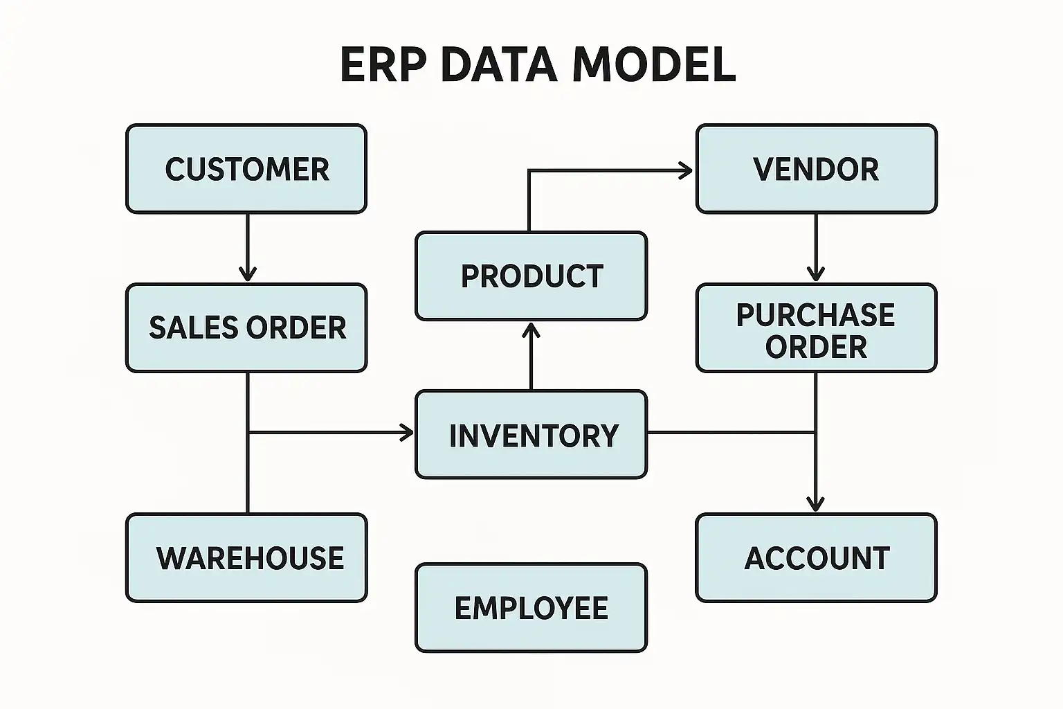 数据模型在ERP系统中扮演着核心角色,它决定了企业信息的组织方式及其流转逻辑。科学的数据模型能有效实现数据共享、跨部门协作,并支撑复杂的业务流程。