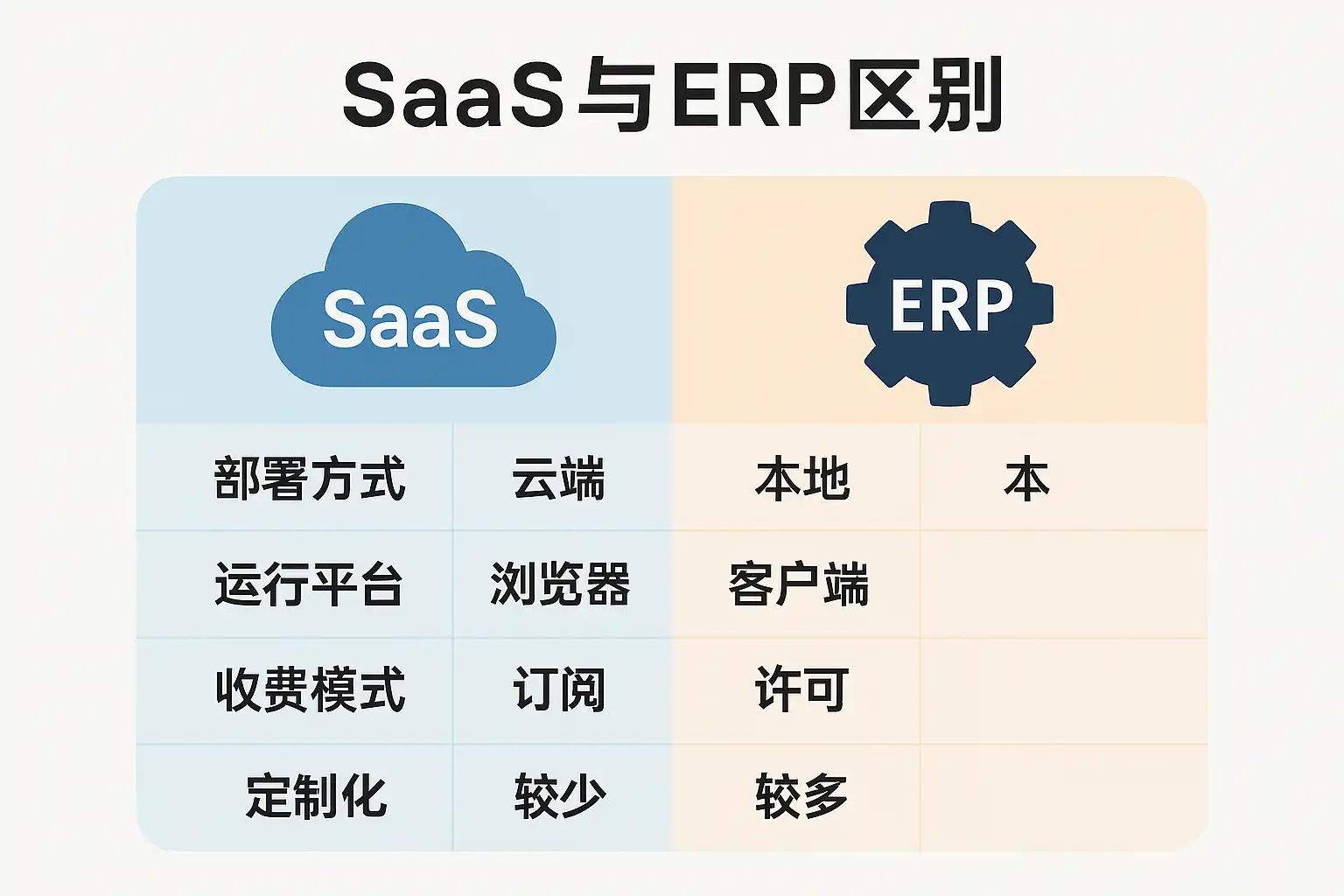 - SaaS为“即开即用”的云端应用,由服务商统一维护;ERP传统上为本地化部署,企业需自建服务器、IT团队维护。