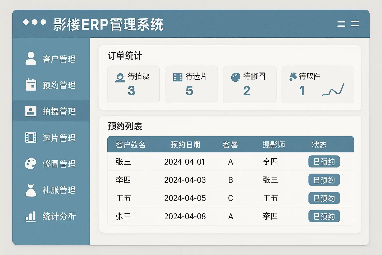 - 小型影楼:推荐使用功能简单、易操作的系统,重点关注客户管理和订单管理。