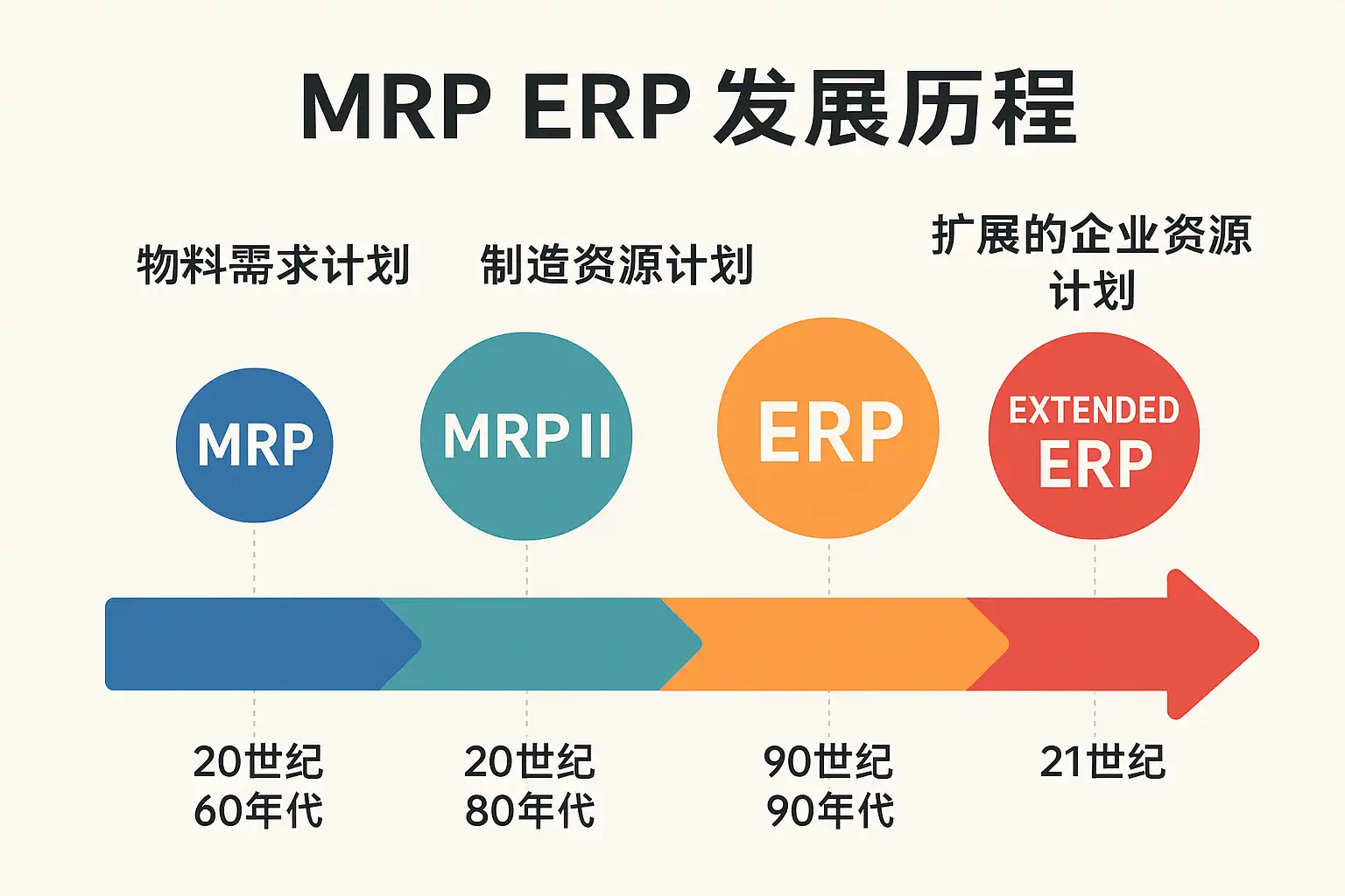 - 20世纪90年代:ERP系统兴起,将MRP功能扩展到财务、人力资源等企业管理模块。