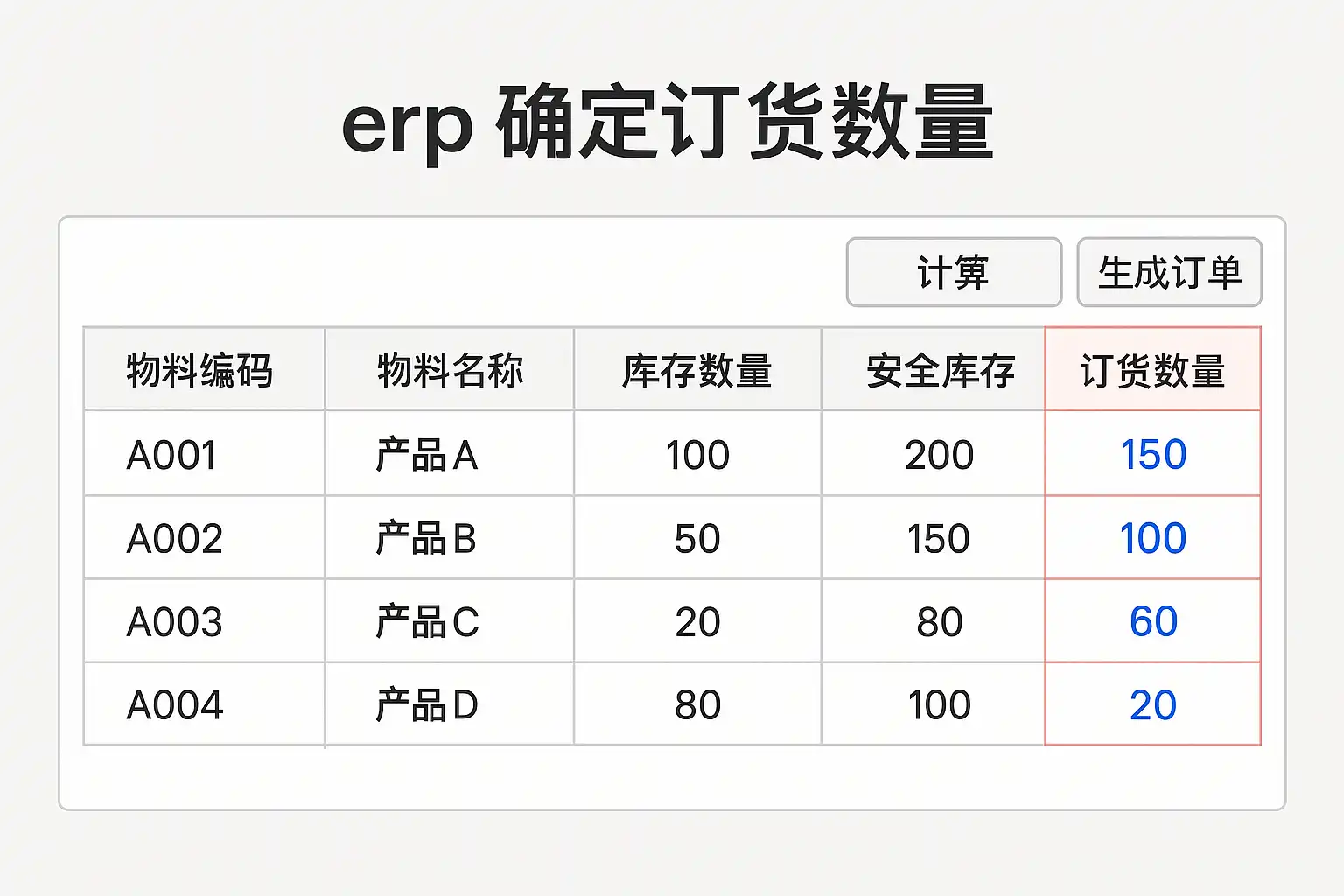 - 将预测需求作为订货量基础,结合安全库存和供应提前期进行综合计算。