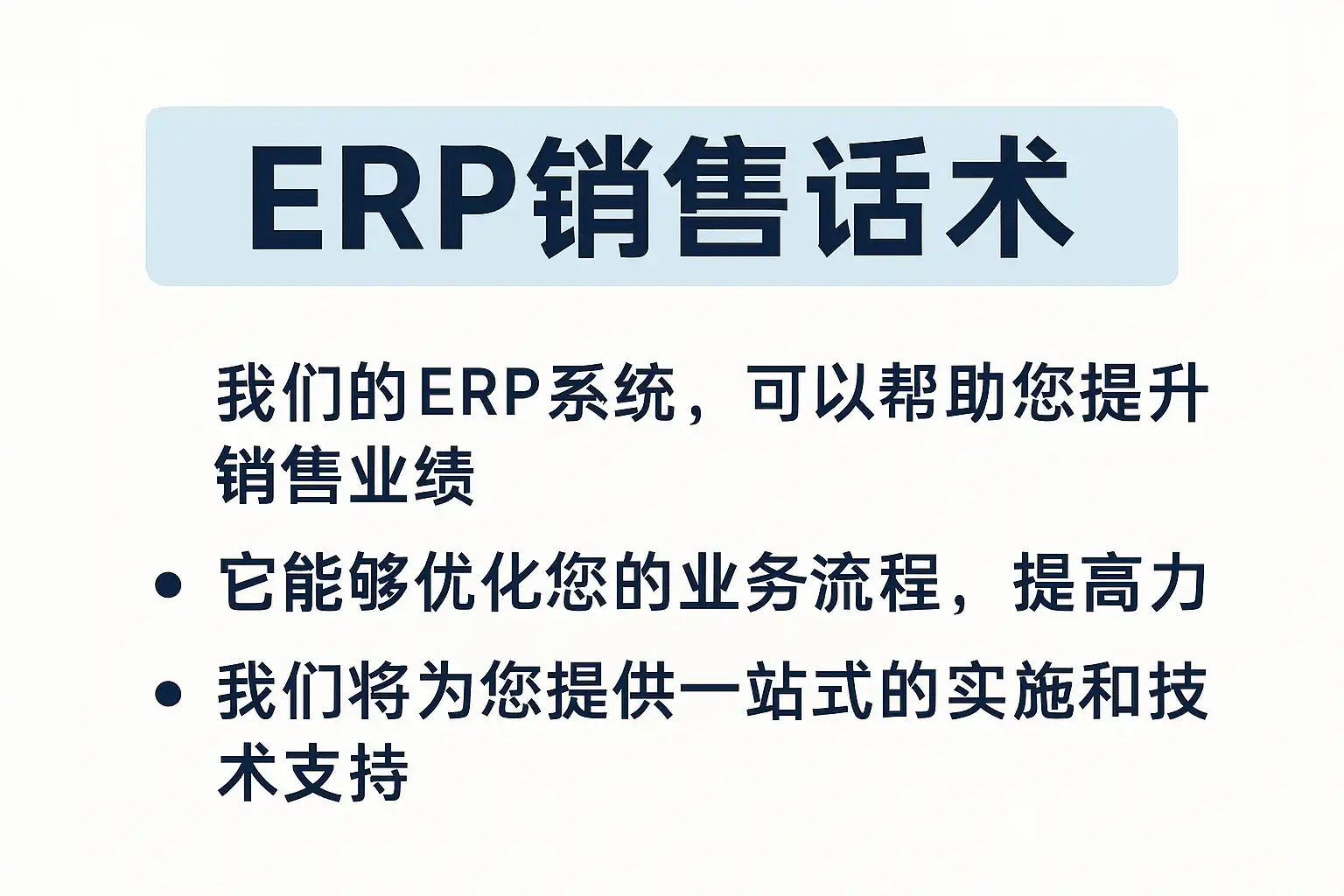 销售过程中,话术需围绕产品或方案的独特优势展开。对ERP系统而言,可从以下几个维度构建价值话术: