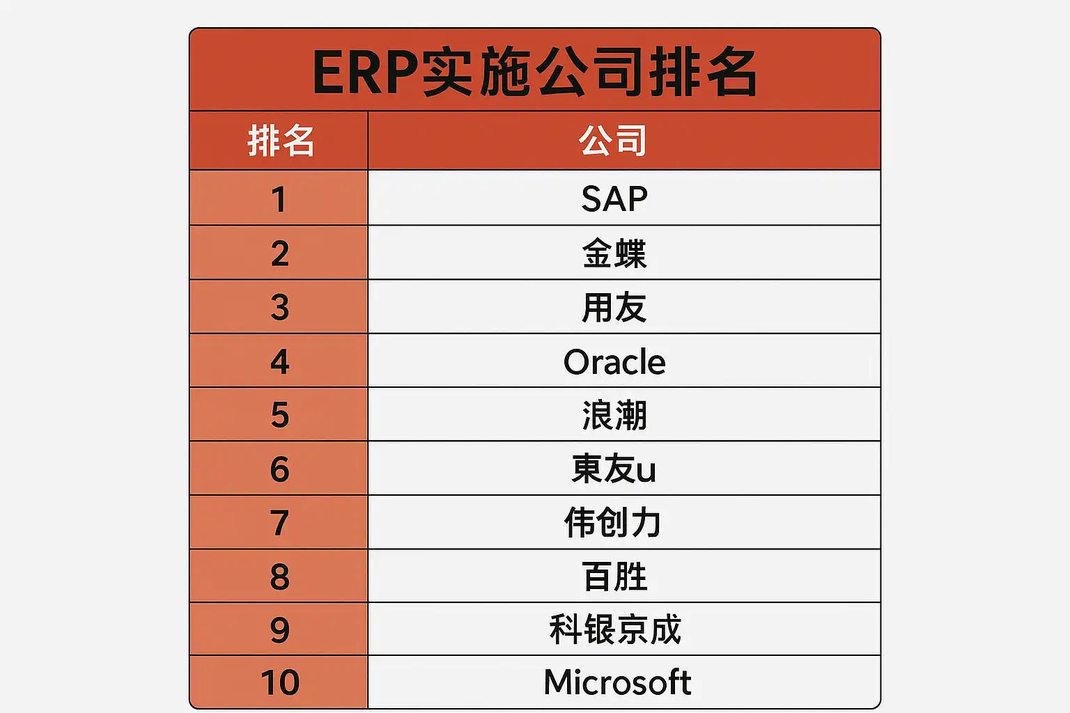 | 2 | 用友(Yonyou) | 行业覆盖广、技术领先 | 政企、制造、服务业 | U8、NC、YonBIP |