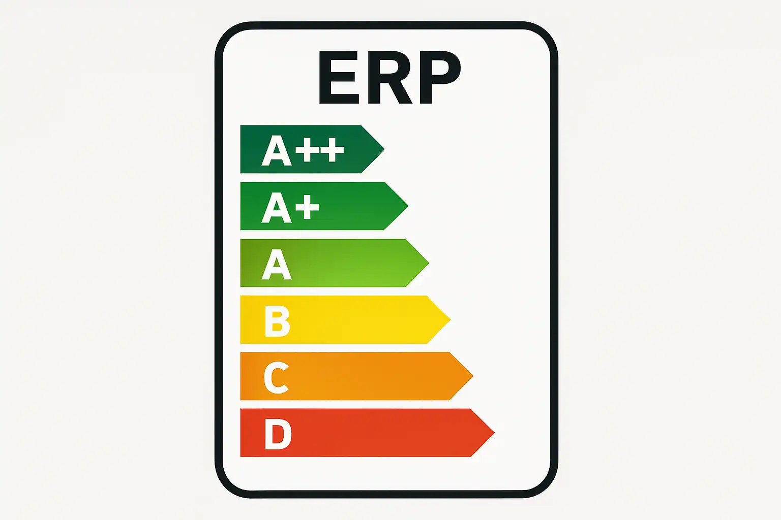 ERP能效标识(Energy-related Products Energy Label)是对家用及办公电器等能耗产品的性能进行分级和信息披露的标准化体系。它通常以图形+分级的形式,标注在产品显著位置,用于展示该产品的能效水平。其本质意义在于: