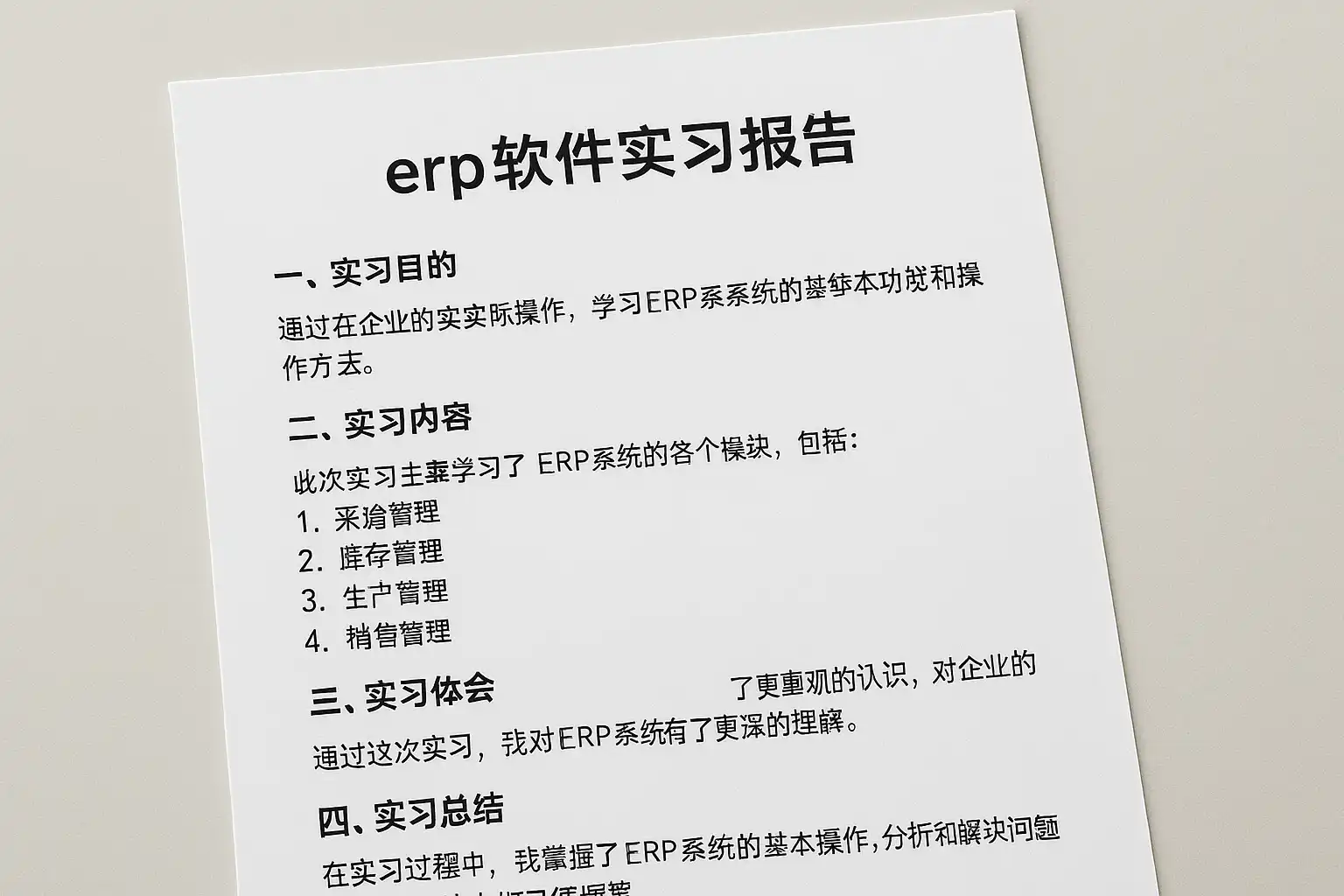 - 使用多级标题(H1、H2、H3)自然融入关键词“ERP软件实习报告”“实习心得”。