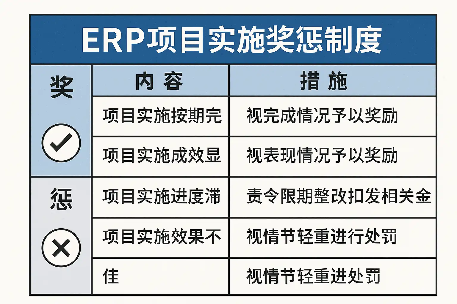 ERP项目实施奖惩制度的科学设计与有效执行,是项目成功的关键保障。企业应: