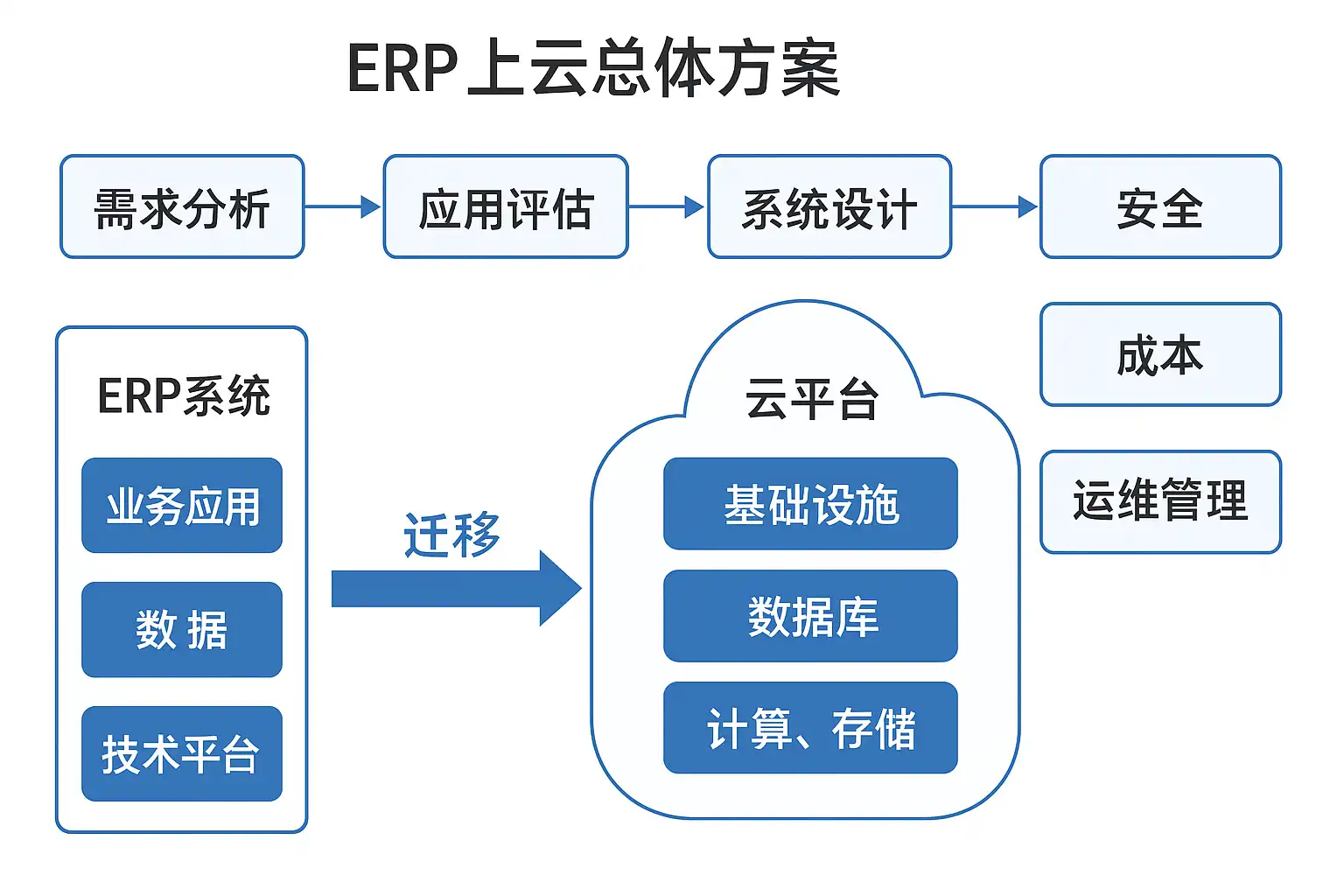ERP(企业资源计划)上云,是指将ERP系统从本地部署(On-Premise)迁移到云端(Cloud),以实现更高效的数据管理、资源整合和业务协同。总体方案包含需求分析、云平台选择、系统迁移、数据安全、集成开发、运维管理与持续优化等关键环节。