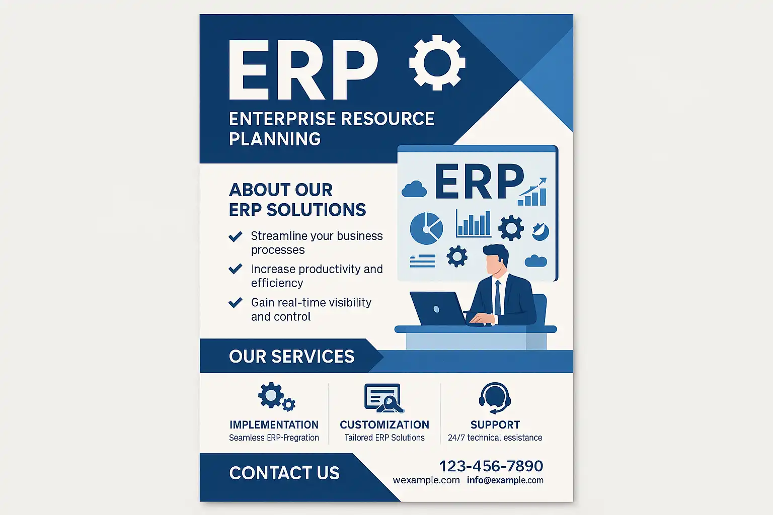 ERP宣传单模板设计的核心要素包括: