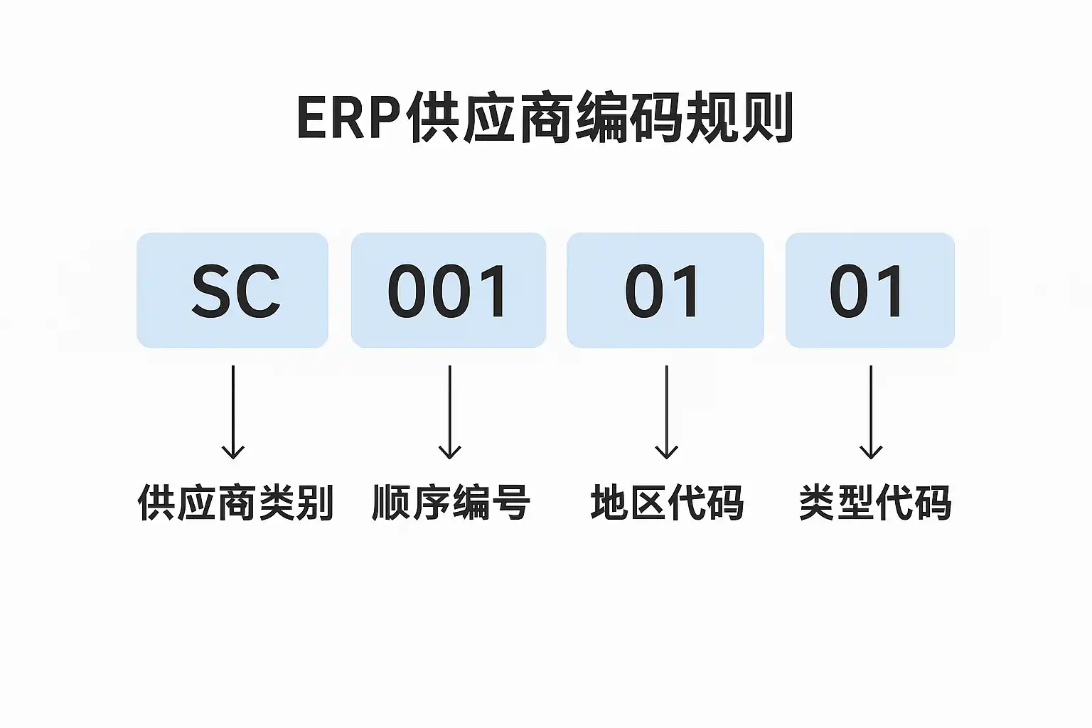 - 逻辑性:编码结构应符合业务逻辑便于理解。 例如,采用“地区代码+供应商类型代码+序列号”的格式,既清晰又易扩展。