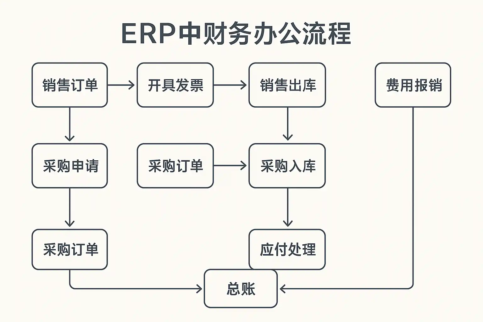 ERP中的财务办公流程涉及从业务数据采集、凭证生成、审批流转、账务处理、报表输出到期末结算的完整链条。其主要流程如下: