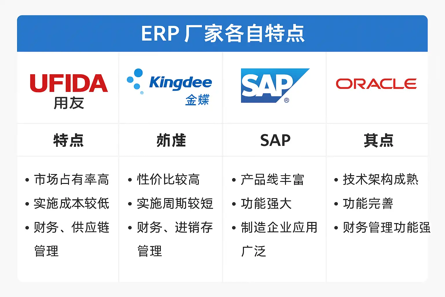 - 跨国集团及大型企业,考虑SAP、Oracle,重视全球化、合规性与大规模集成能力。
