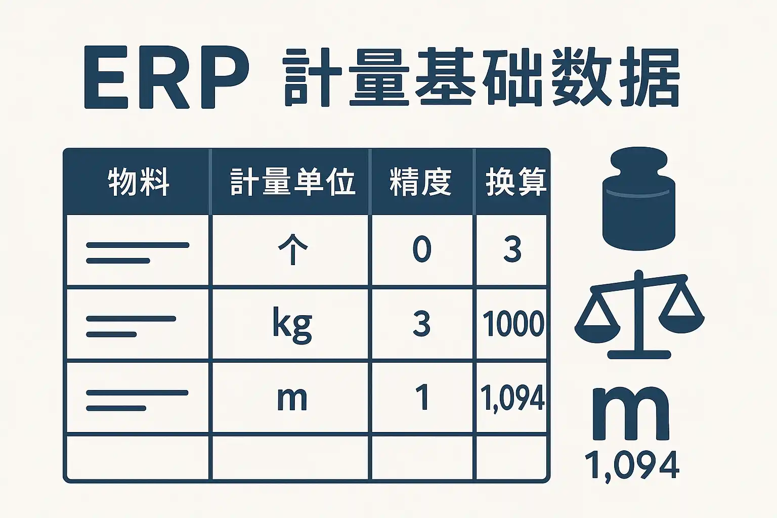计量基础数据是指企业在生产、采购、销售、仓储等环节中使用的计量单位、换算关系、标准值等基础信息。这些数据直接影响物料出入库、成本核算、订单执行和财务结算的准确性。