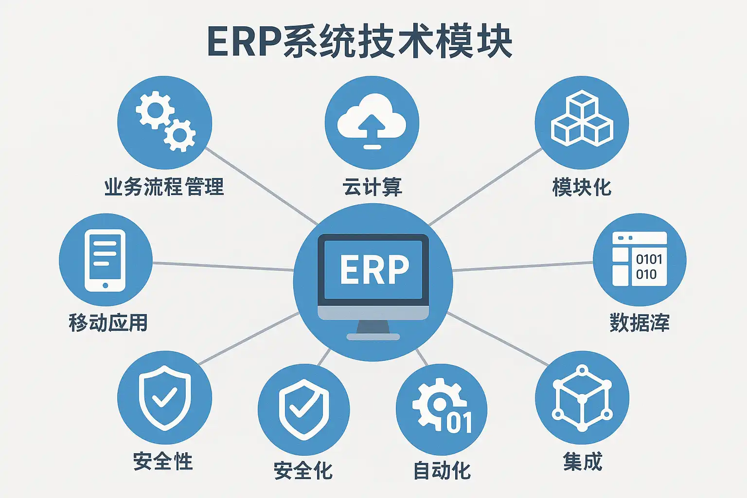 ERP(Enterprise Resource Planning,企业资源计划)系统是集成企业各类资源、提升管理与运营效率的信息化平台。其模块化设计可灵活应对不同企业的需求,常见技术模块包括:
